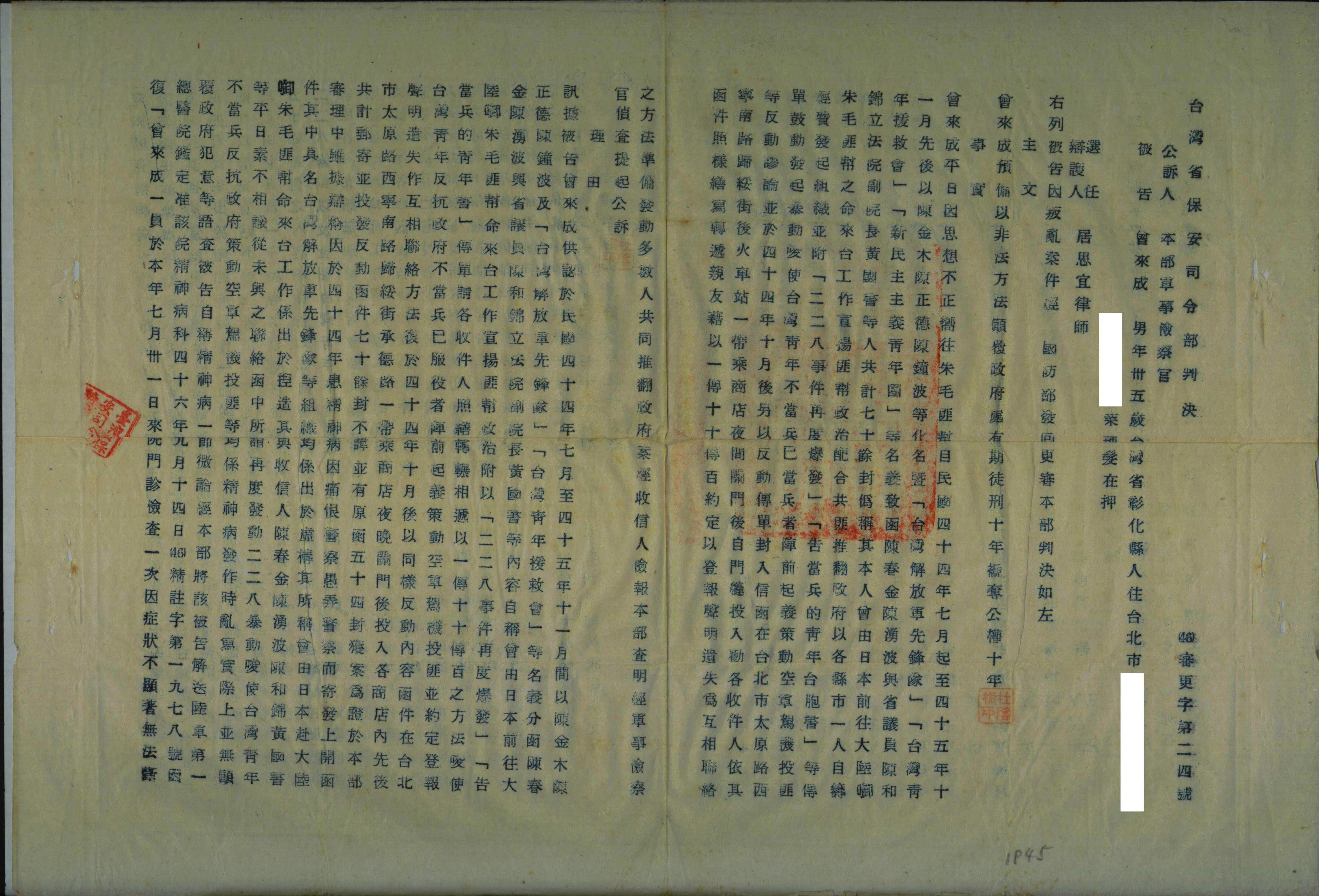 審理機關:臺灣省保安司令部