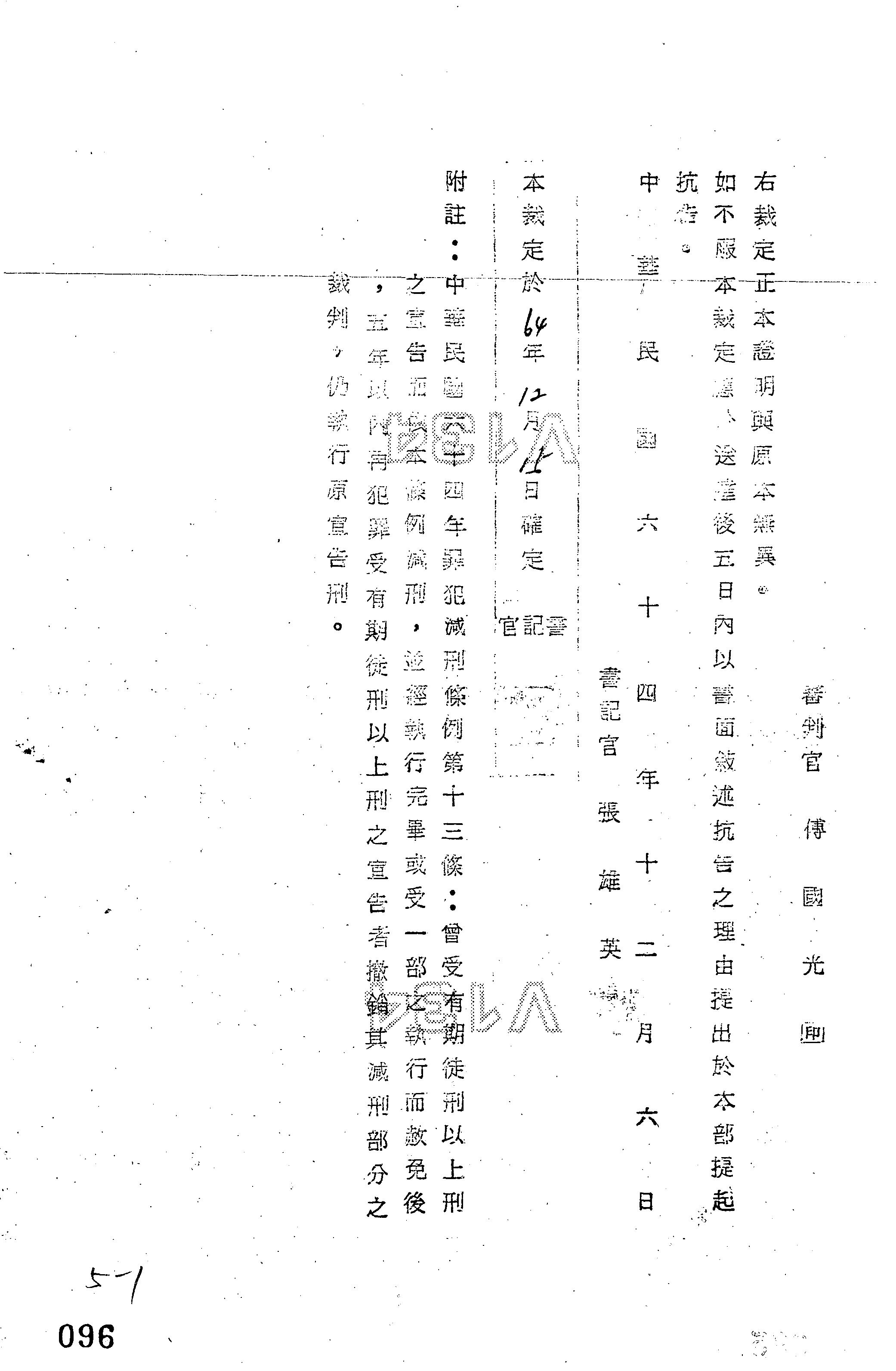 臺灣警備總司令部64年諫減字第0495號裁定書