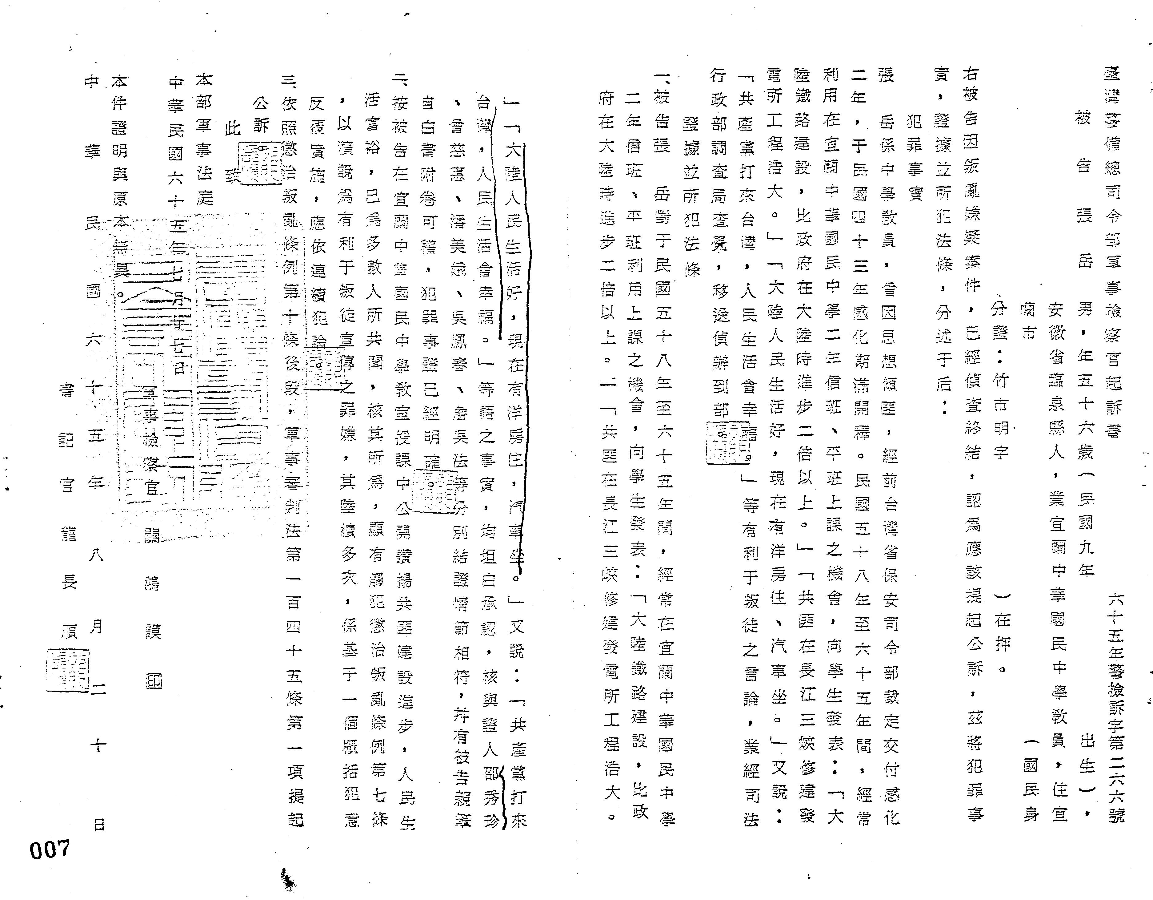 臺灣警備總司令部65年警檢訴字第0266號軍事檢察官起訴書