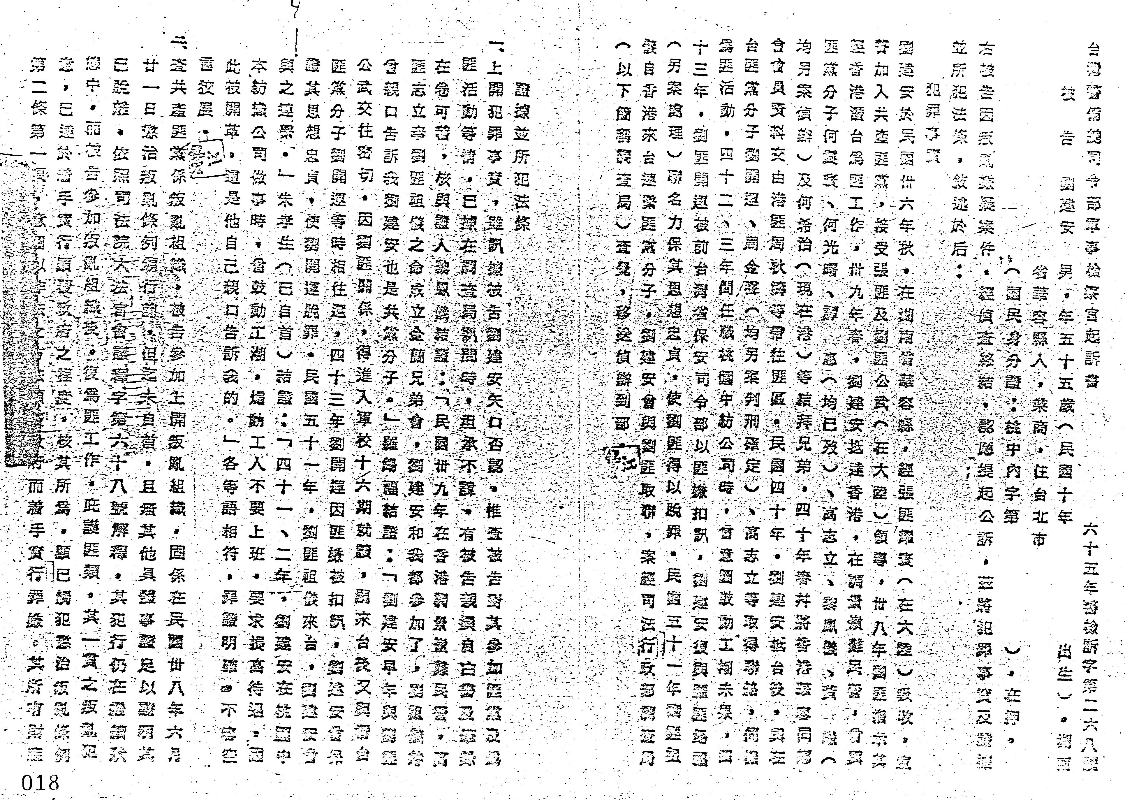 裁判書主文/要旨:劉建安因叛亂嫌疑案件業經偵查終結認應提起公訴。