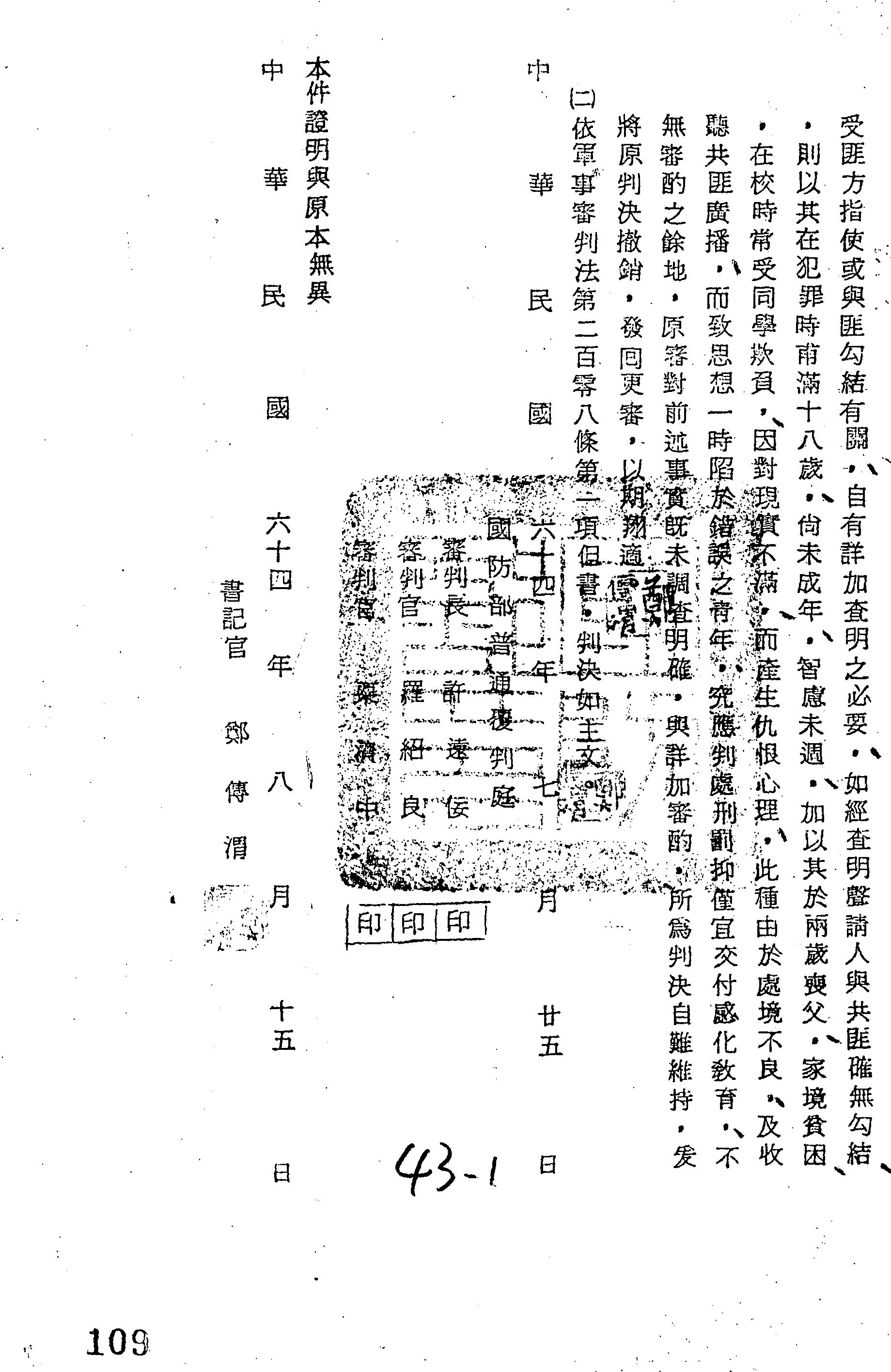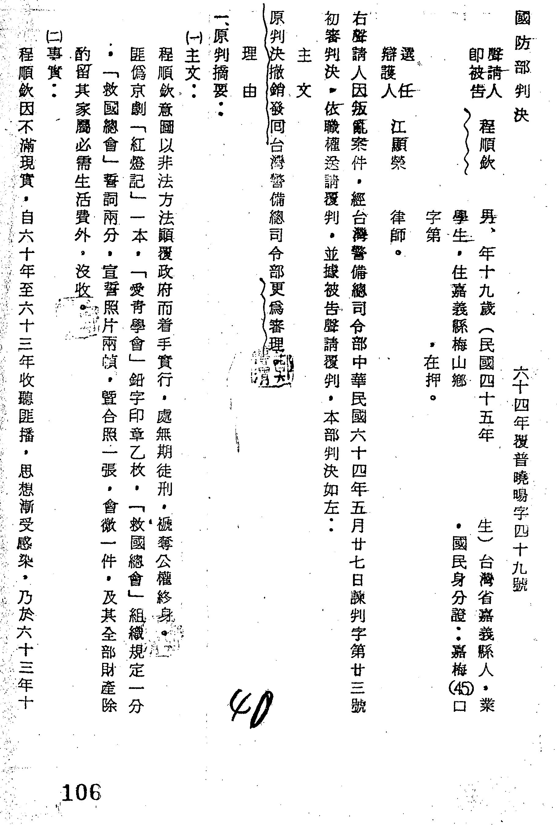 國防部64年覆普曉暘字第0049號判決書