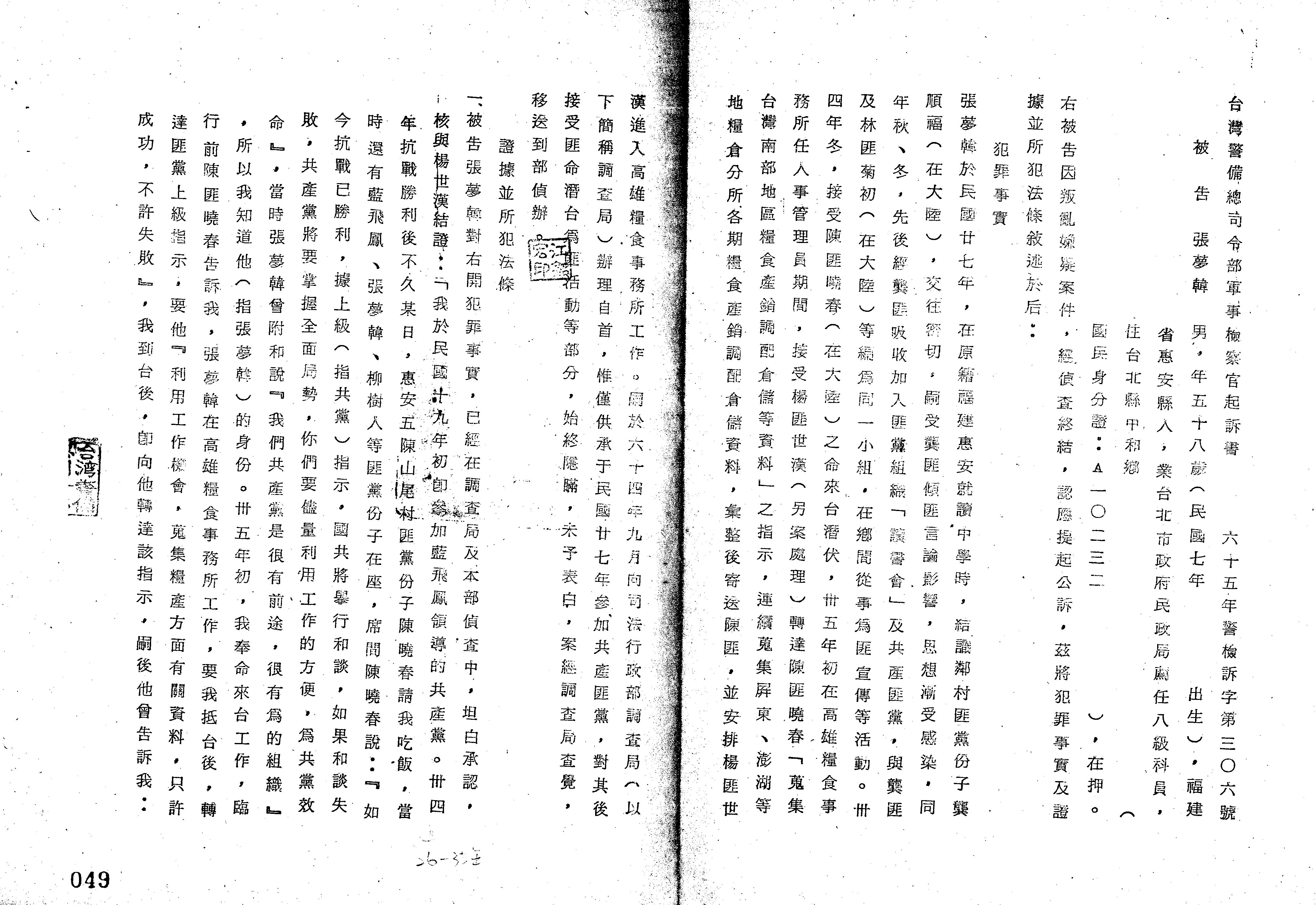 臺灣警備總司令部65年警檢訴字第0306號軍事檢察官起訴書