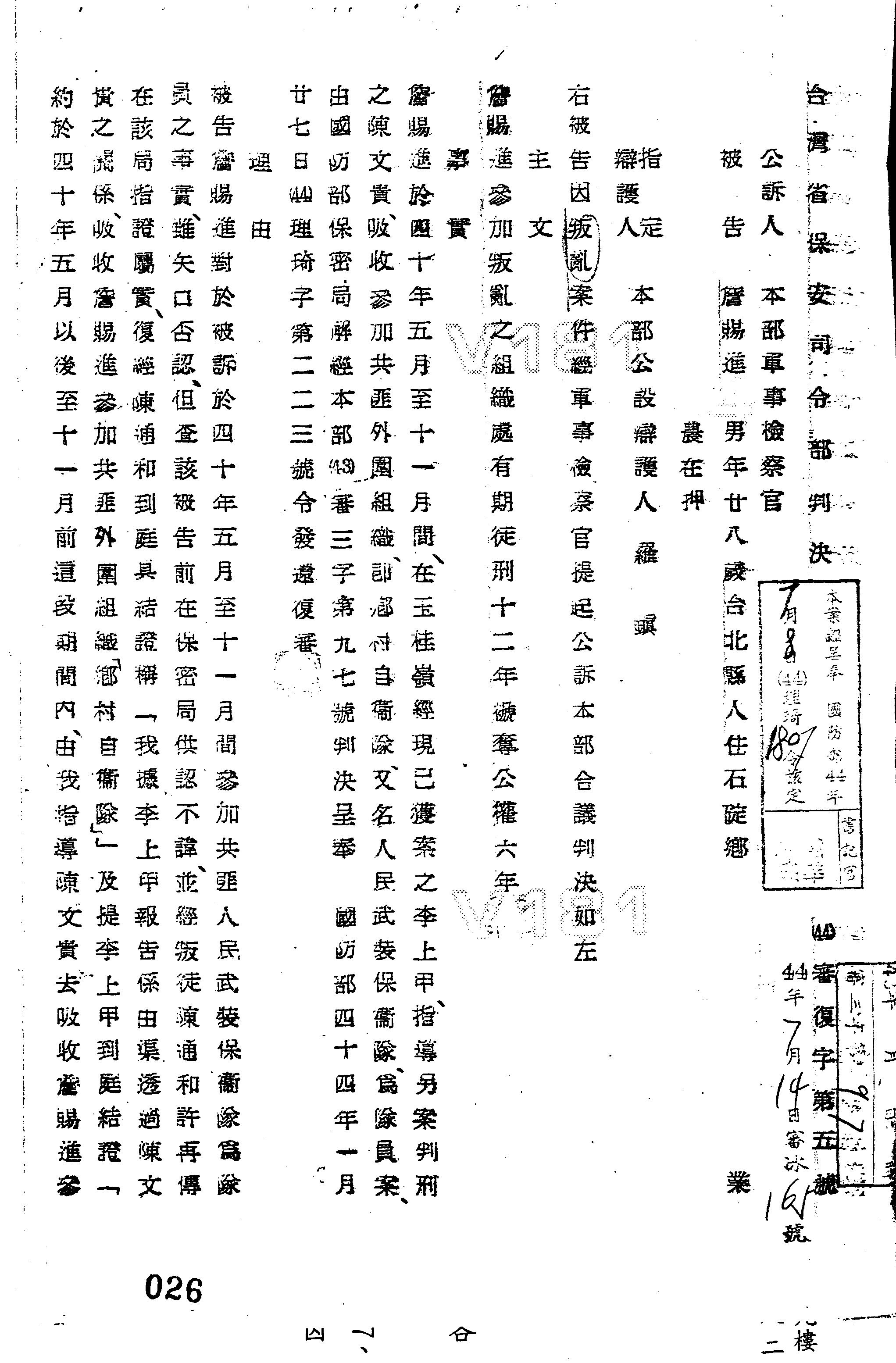 裁判書主文/要旨:詹賜進「參加叛亂之組織」處有期徒刑12年,褫奪公權6年。