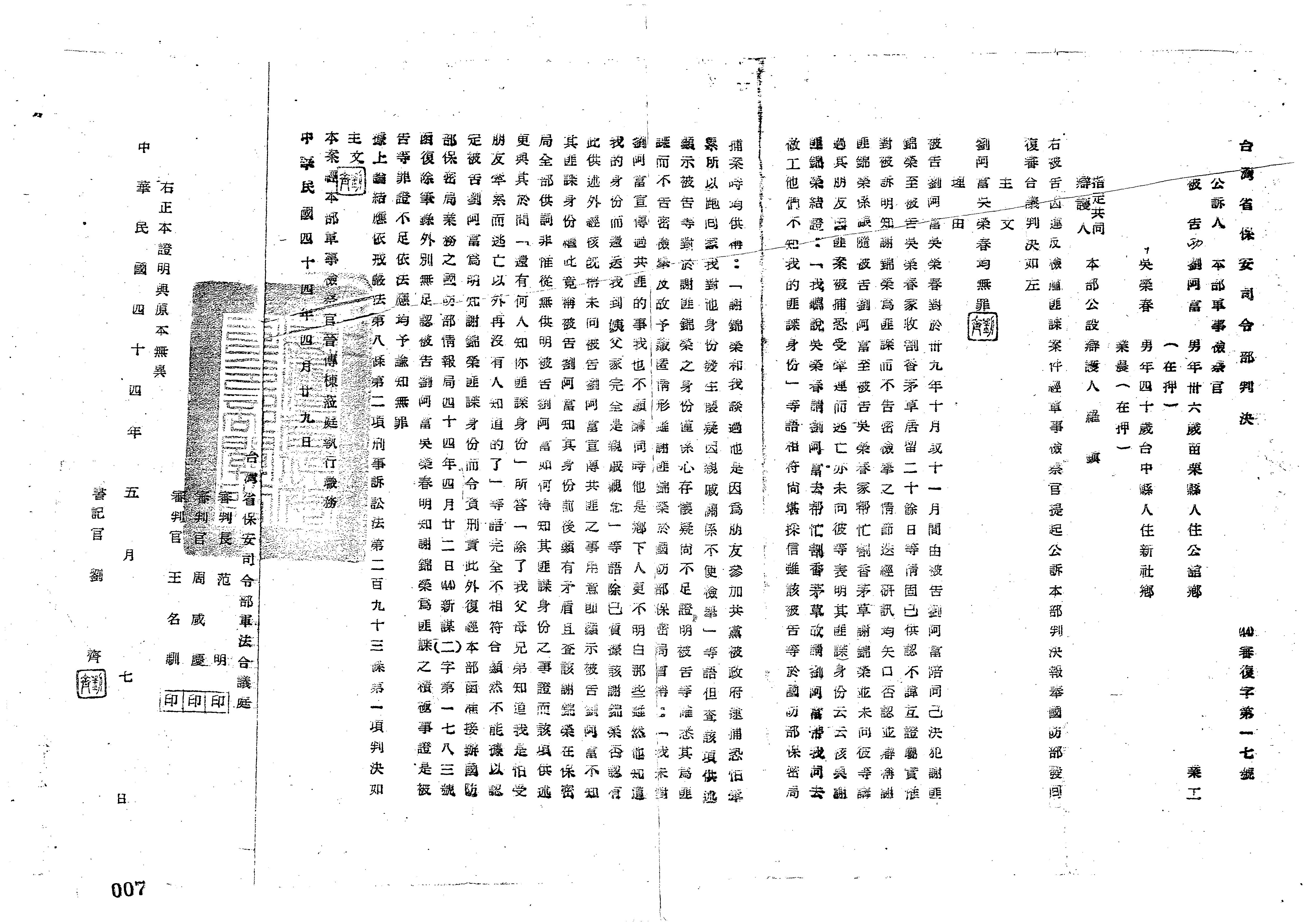 臺灣省保安司令部44年審復字第0017號判決書