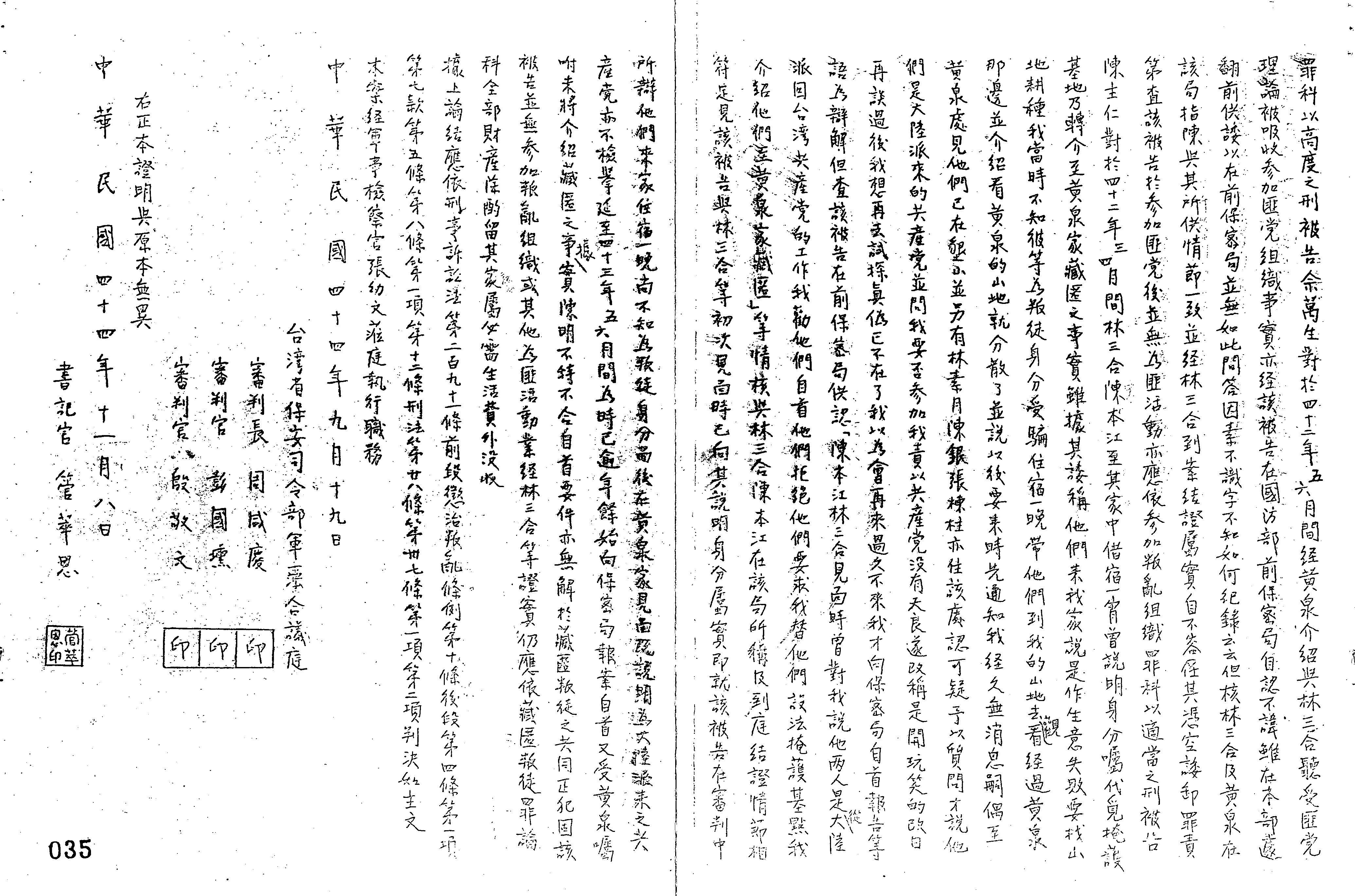 - 法條:刑事訴訟法第291條前段;懲治叛亂條例第10條後段、第4條第1項第7款、第5條、第8條第1項、第12條;刑法第28條、第37條第1項、第37條第2項