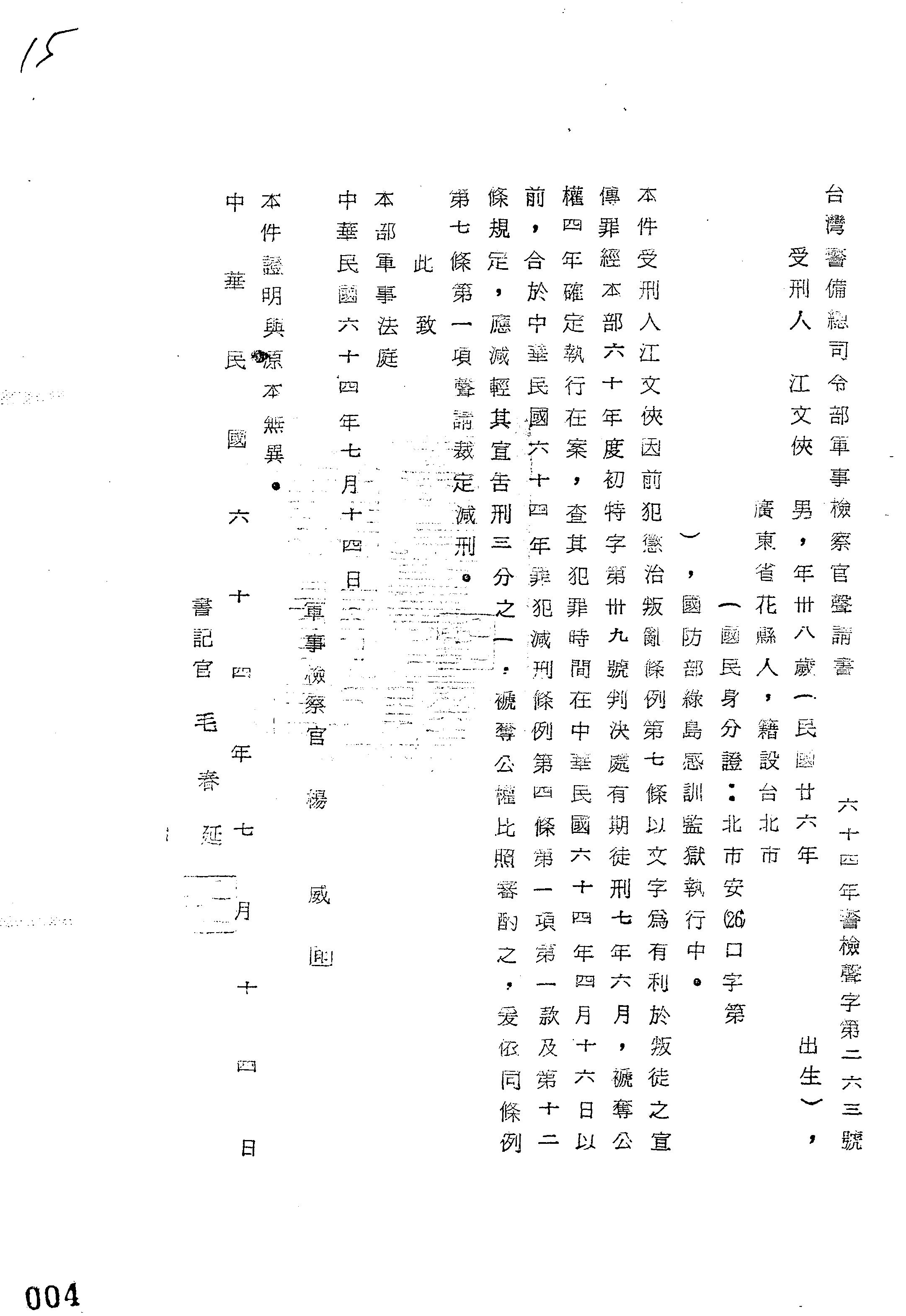 臺灣警備總司令部64年警檢聲字第0263號軍事檢察官聲請書