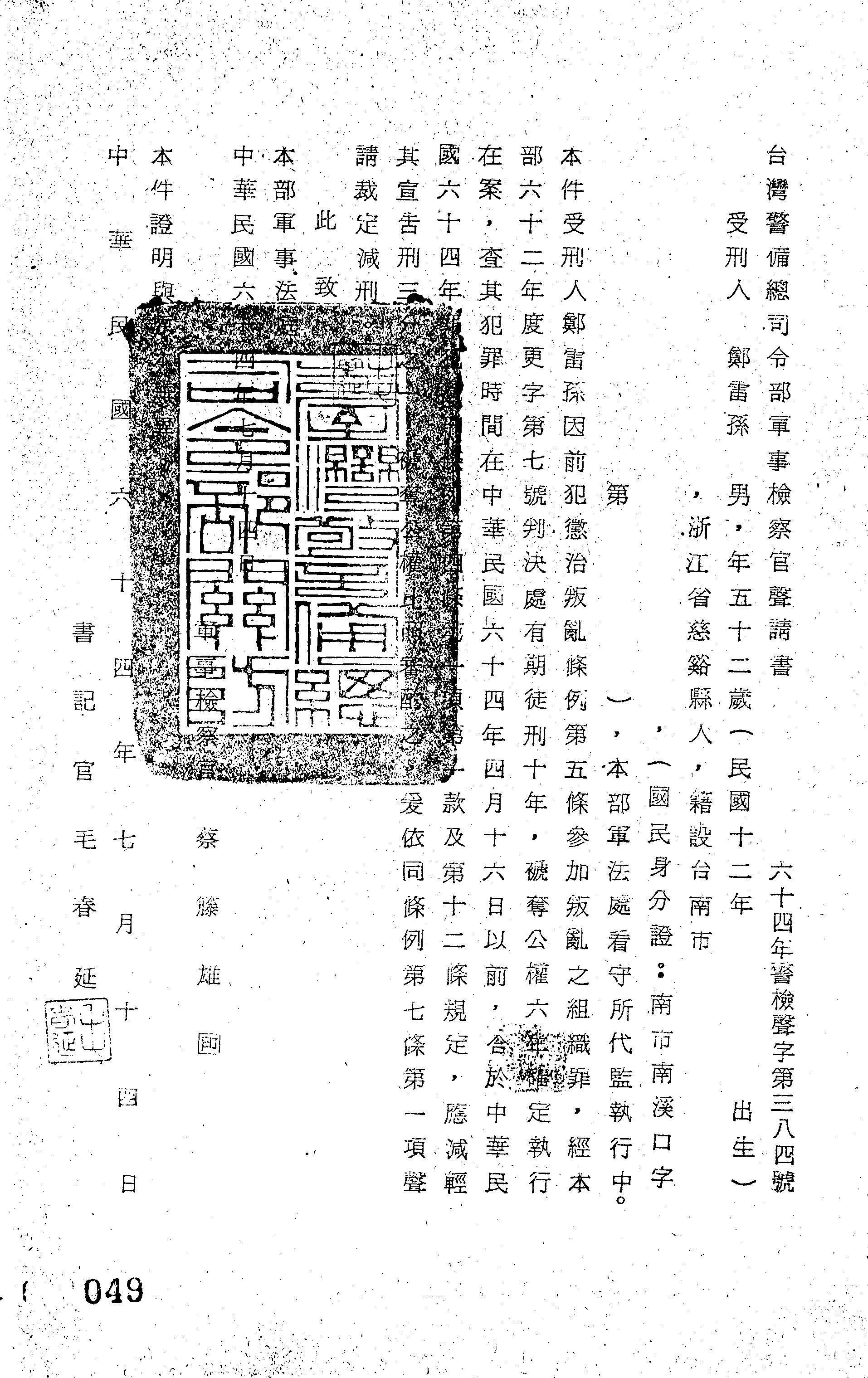 臺灣警備總司令部64年警檢聲字第0384號軍事檢察官聲請書
