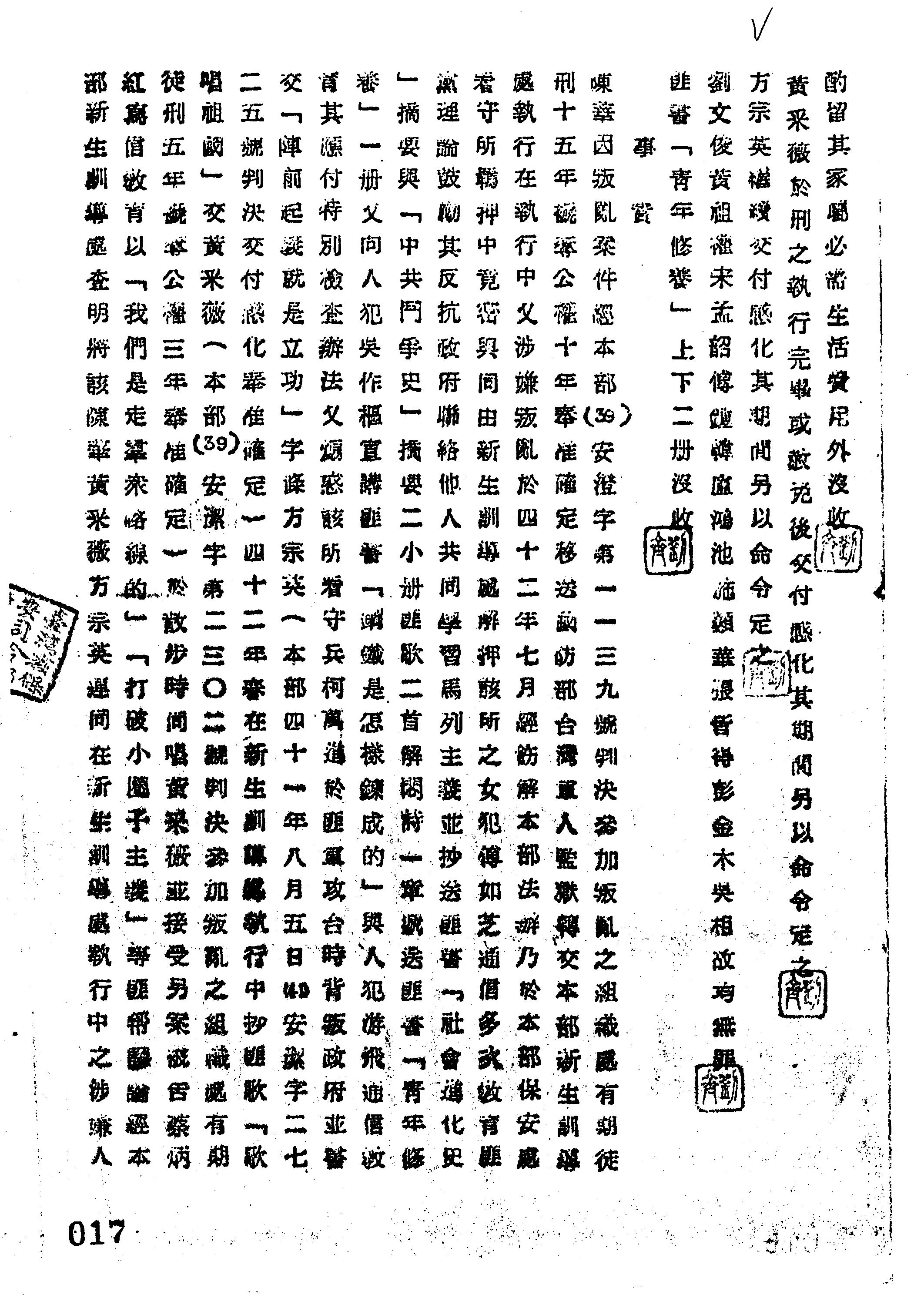 - 法條:刑事訴訟法第291條前段、第293條第1項;懲治叛亂條例第10條後段、第2條第1項、第8條第1項、第12條;戡亂時期檢肅匪諜條例第8條第1項第2款;刑法第37條第1項、第38條第1項第1款
