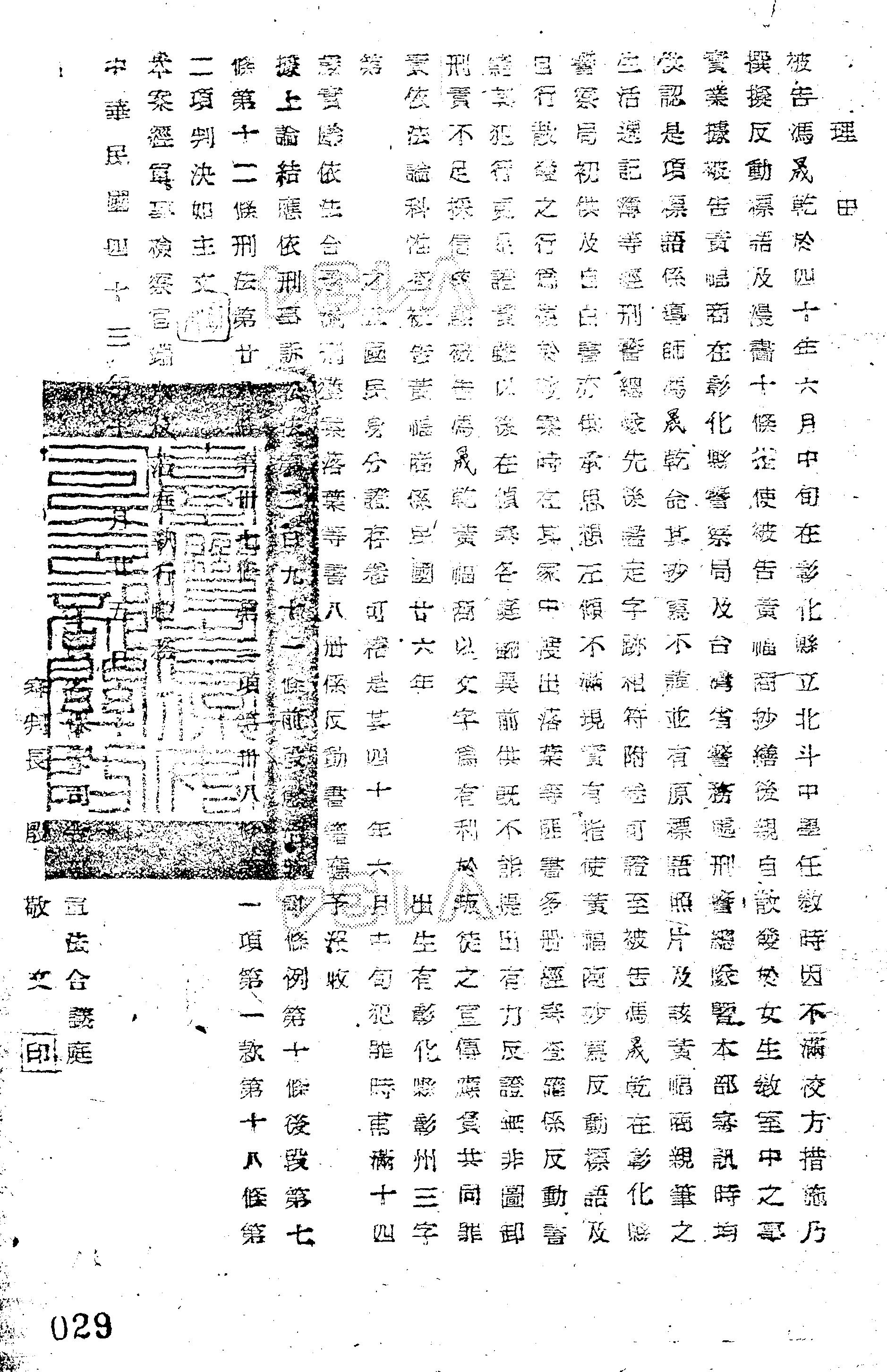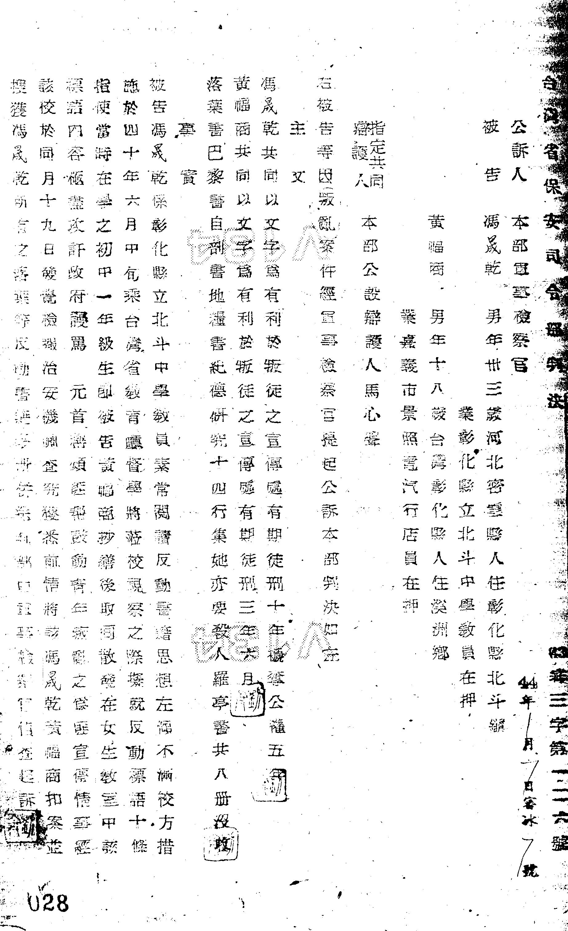 - 法條:刑事訴訟法第291條前段;懲治叛亂條例第10條後段、第7條、第12條;刑法第28條、第37條第2項、第38條第1項第1款、第18條第2項