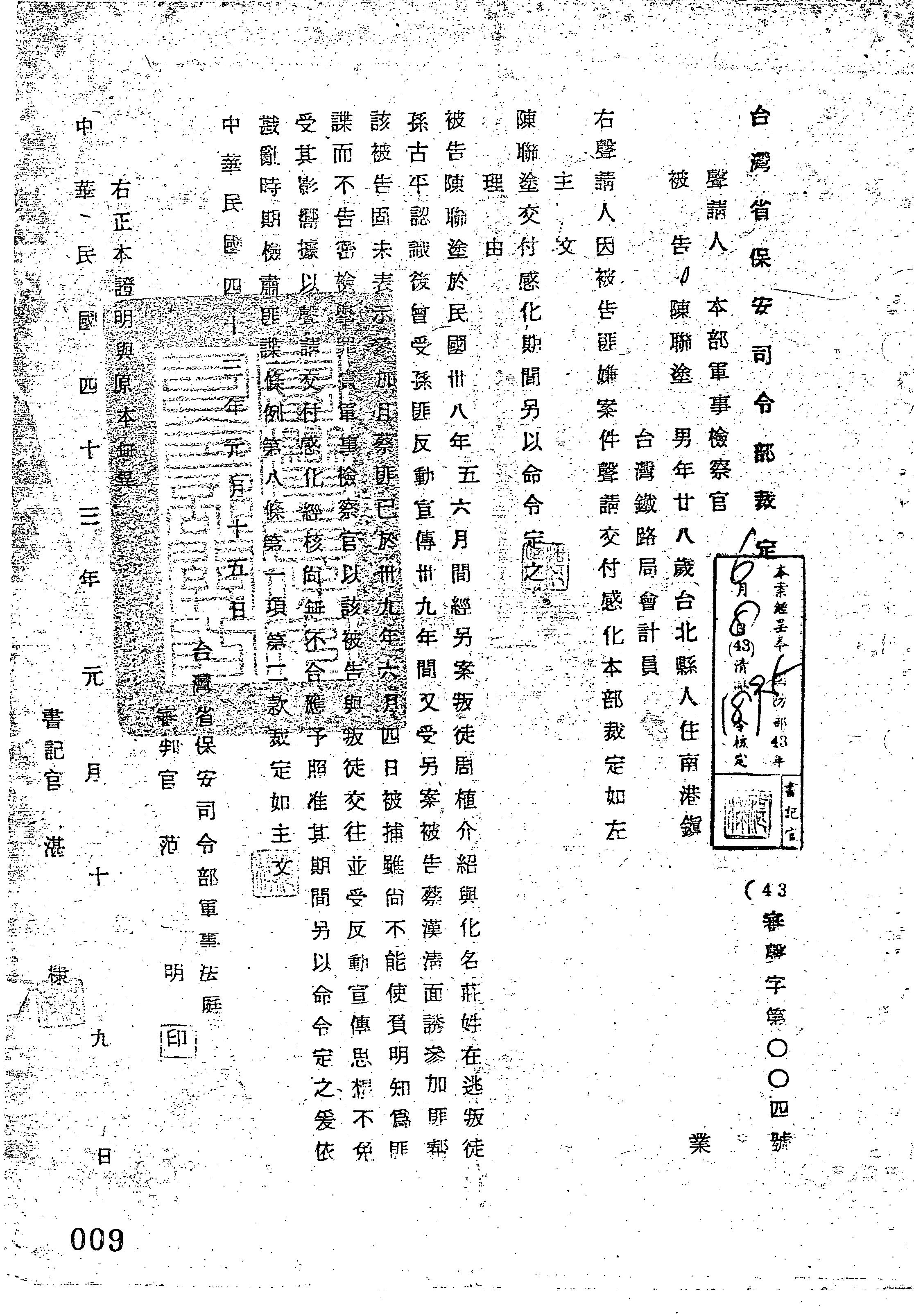 臺灣省保安司令部43年審聲字第0004號裁定書