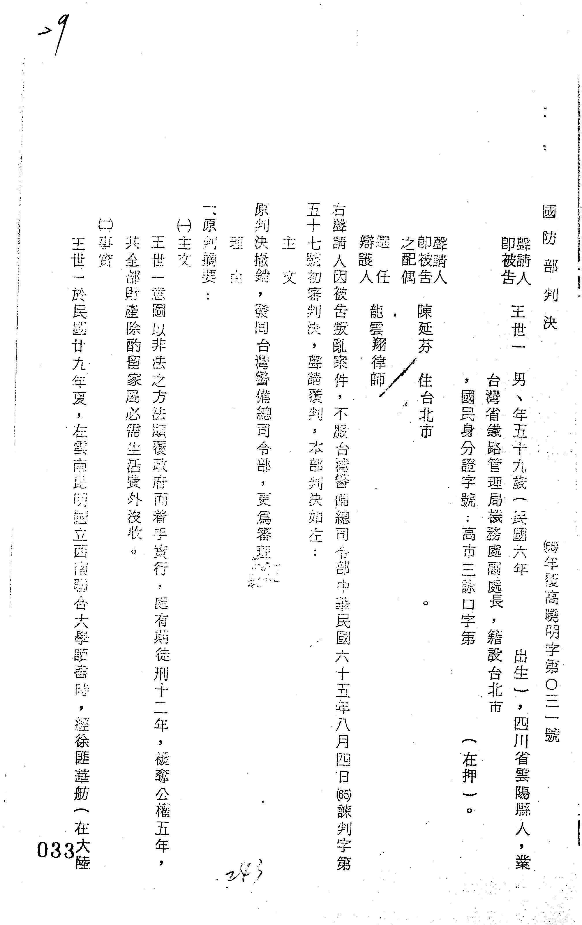 裁判書主文/要旨:原判決撤銷,發回臺灣警備總司令部,更為審理。