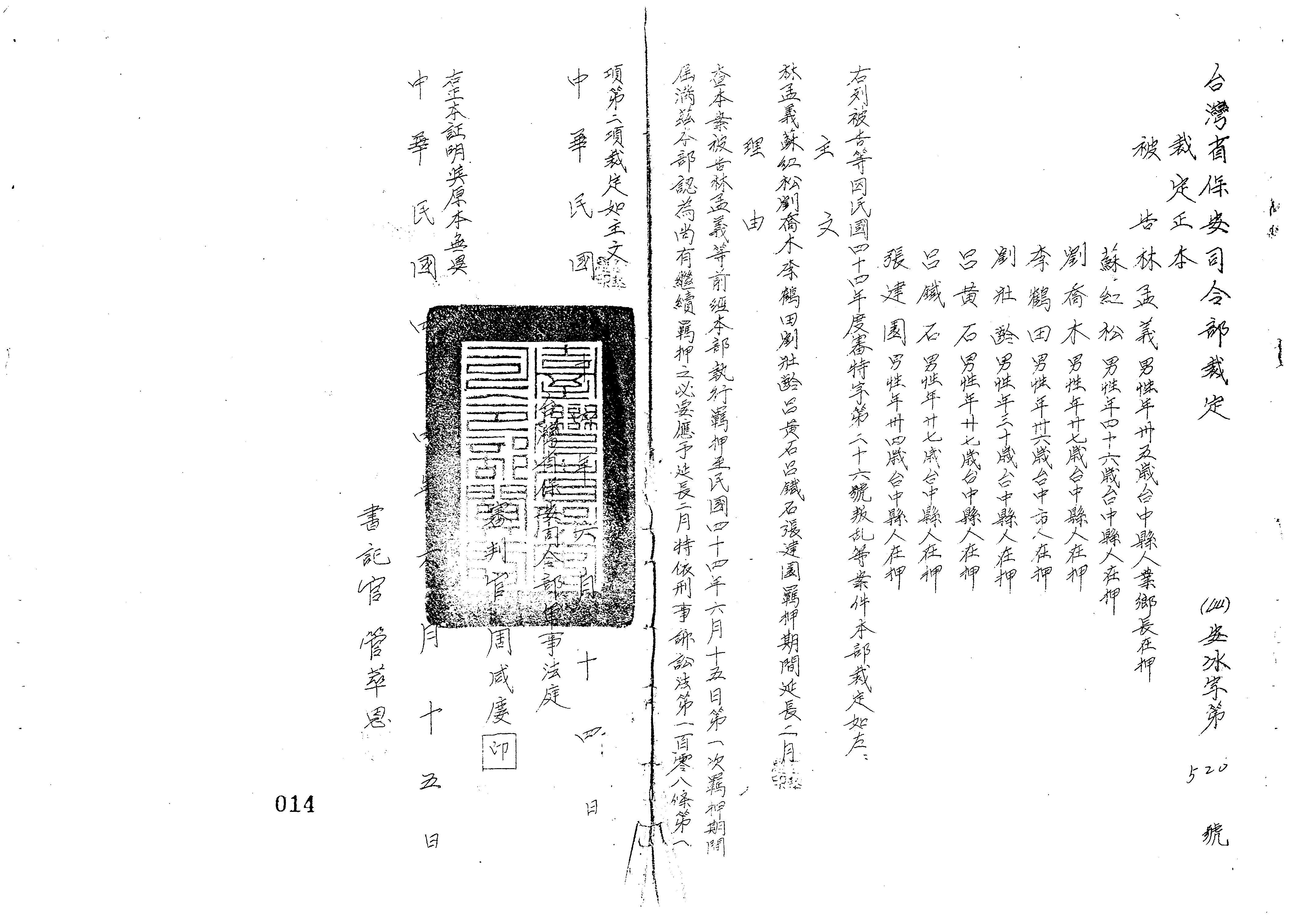 審理機關:臺灣省保安司令部