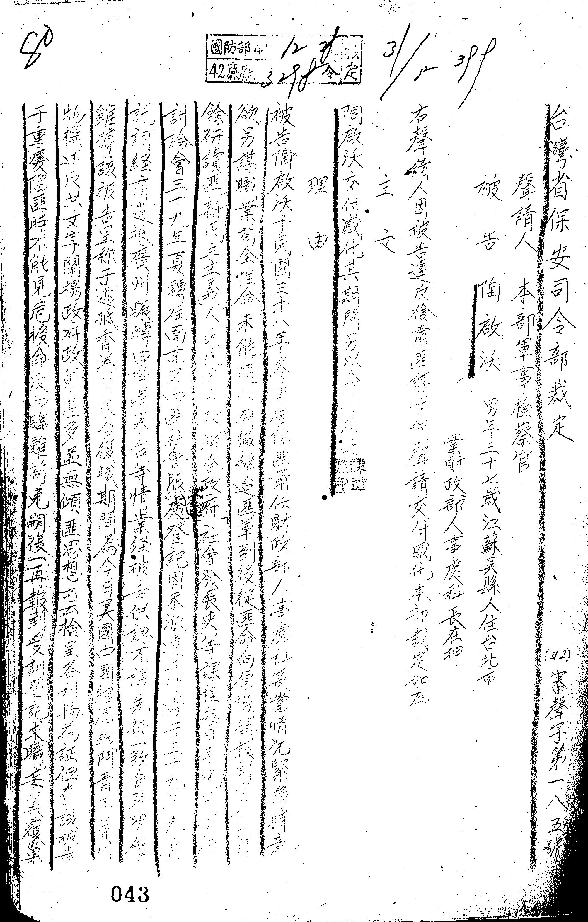 臺灣省保安司令部42年審聲字第0185號裁定書