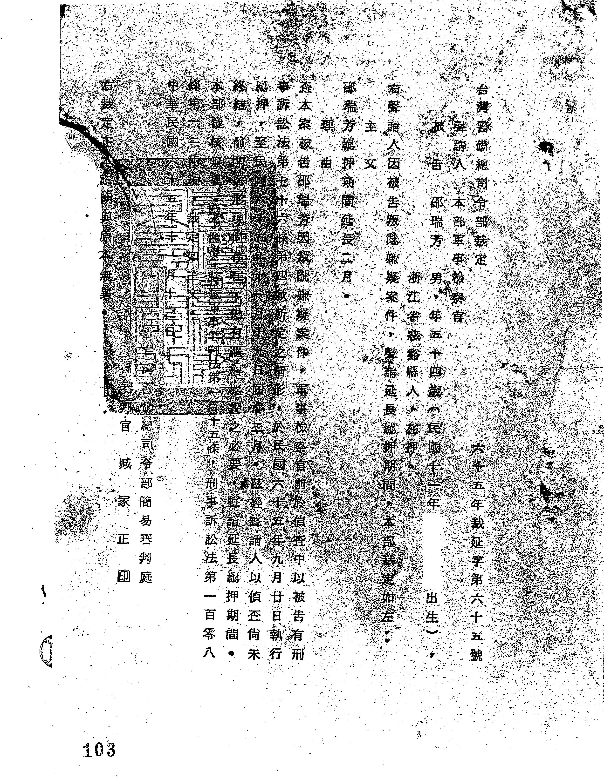 臺灣警備總司令部65年裁延字第0065號裁定書