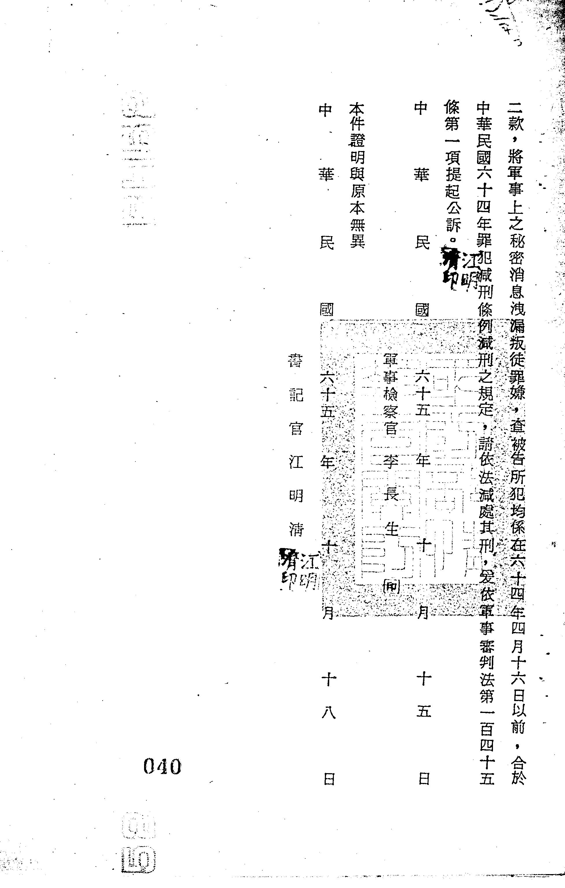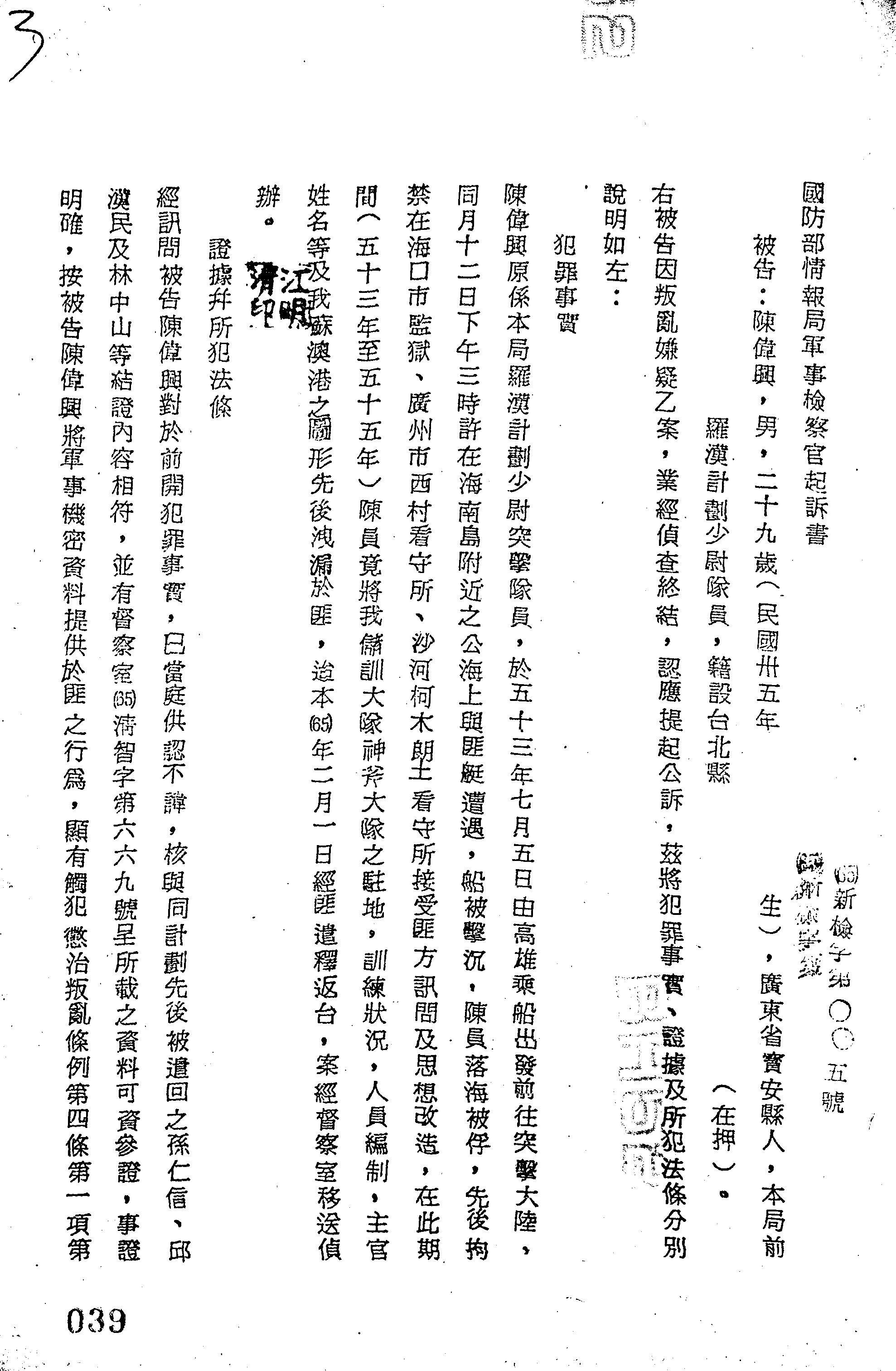 國防部情報局65年新檢字第0005號軍事檢察官起訴書