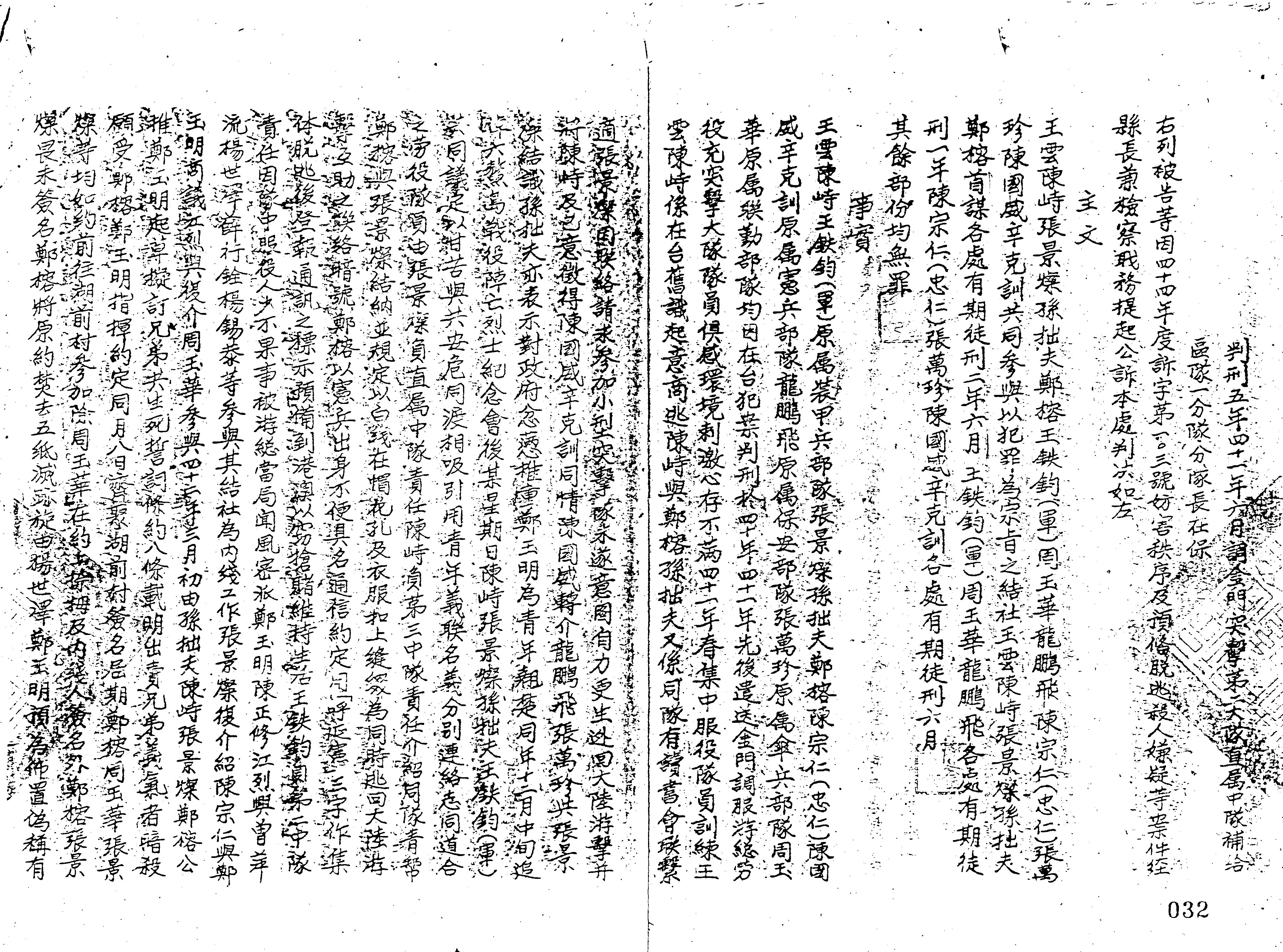 - 裁判書主文/要旨:王雲、陳峙、張景燦、孫拙夫、鄭榕、王鐵鈞(軍)、周玉華、龍鵬飛、陳宗仁(忠仁)、張萬珍、陳國威、辛克訓「共同參與以犯罪為宗旨之結社」,王雲、陳峙、張景燦、孫拙夫、鄭榕首謀各處有期徒刑2年6月;王鐵鈞(軍)、周玉華、龍鵬飛各處有期徒刑1年;陳宗仁(忠仁)、張萬珍、陳國威、辛克訓各處有期徒刑6月。其餘部分均無罪。
