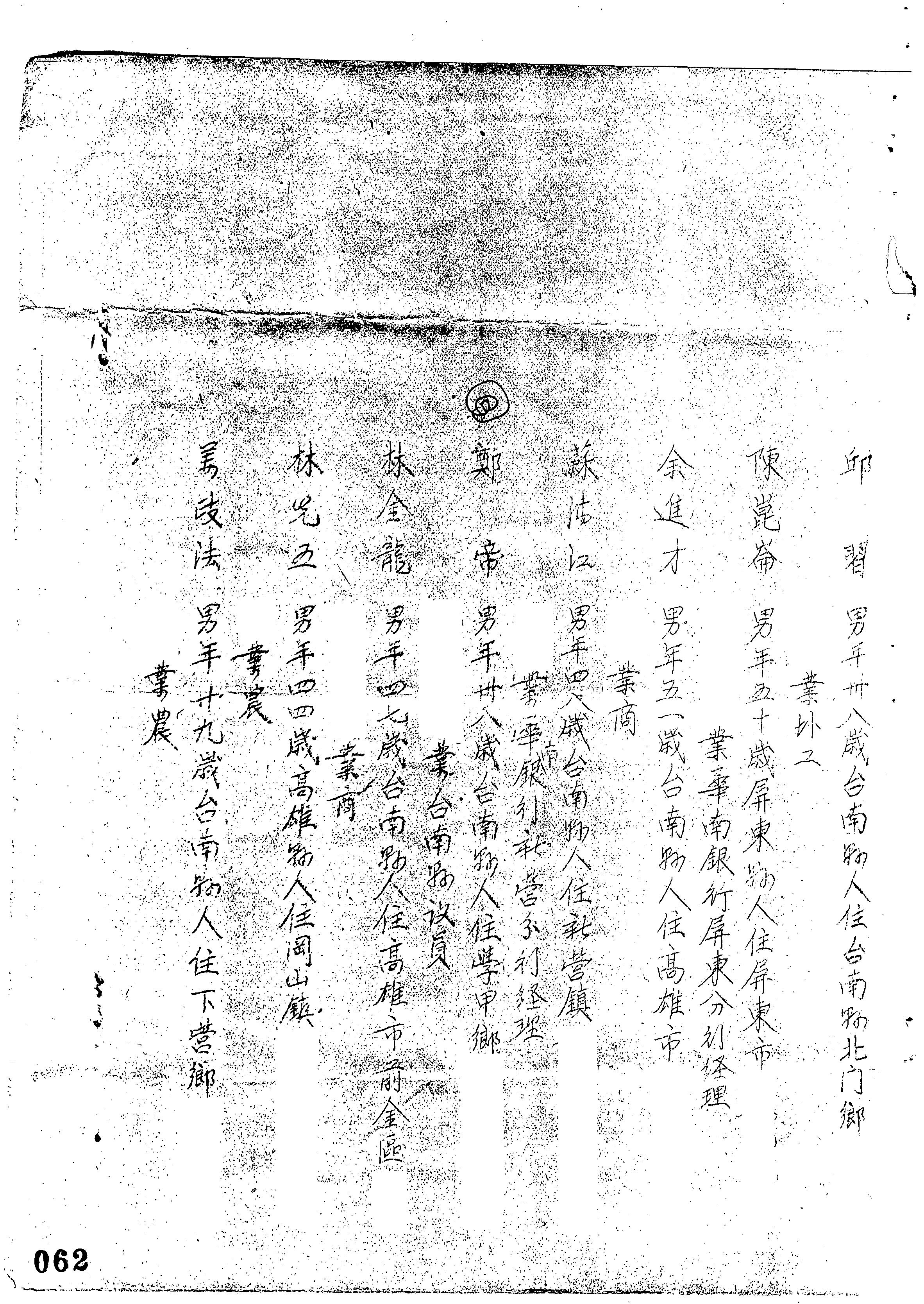 吳鵬燦、吳辛田、楊俊謨、黃開枝、張天陣、梁銘杉、王寬和、邱習、陳崑崙、余進才、蘇清江、鄭帝、林金龍、林先五、姜政法