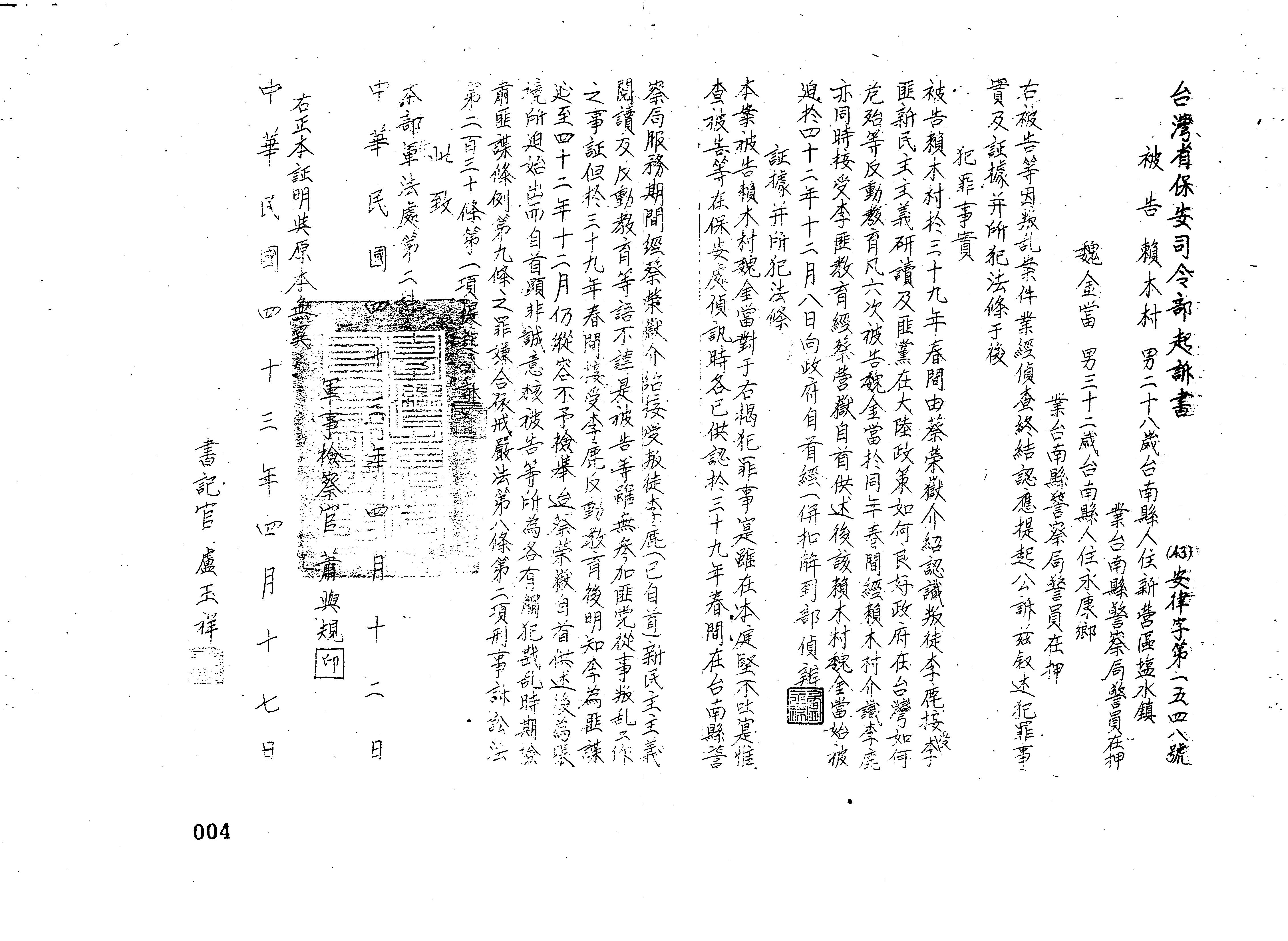 裁判書主文/要旨:賴木村等因叛亂案件業經偵查終結認應提起公訴。