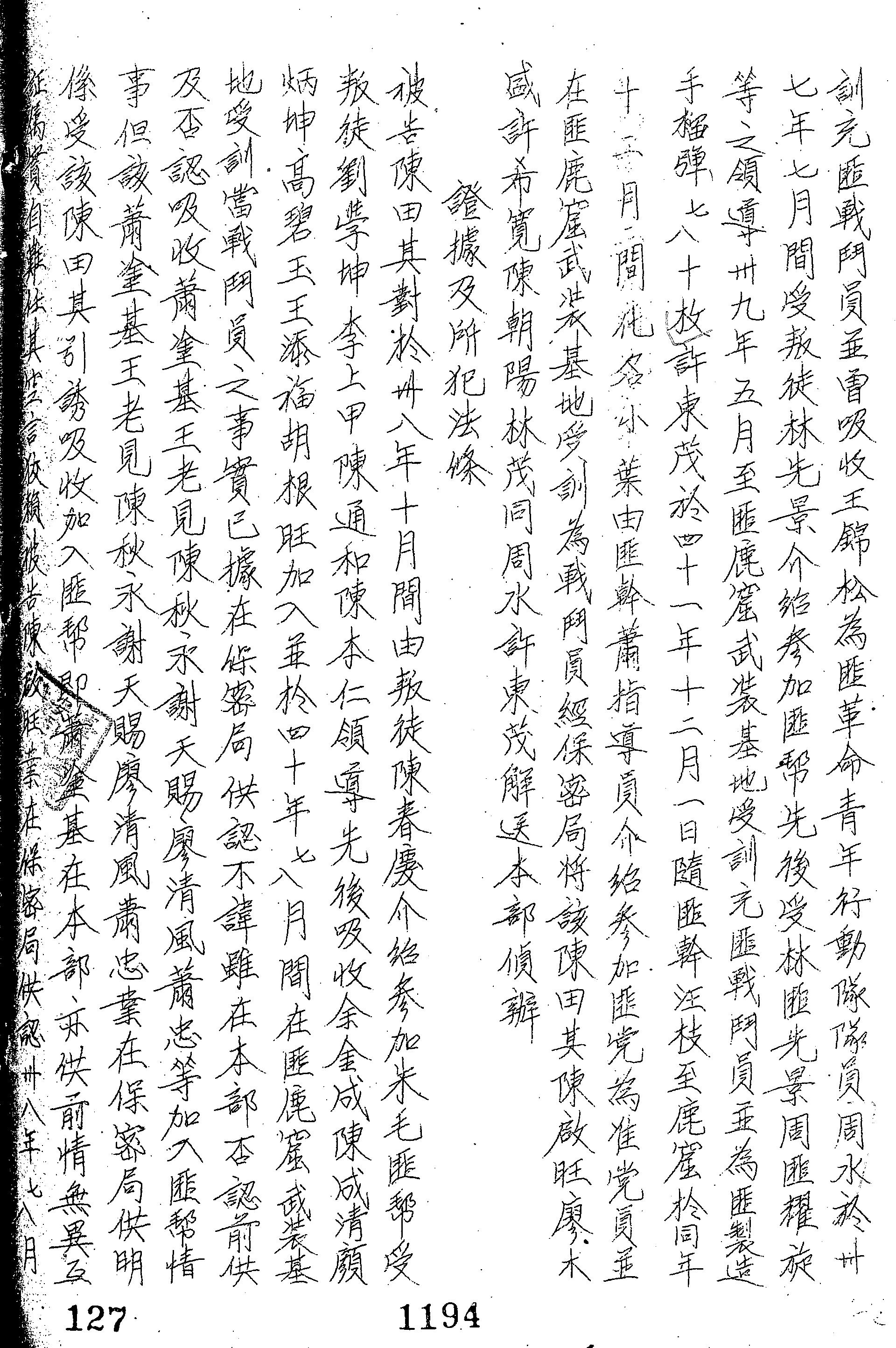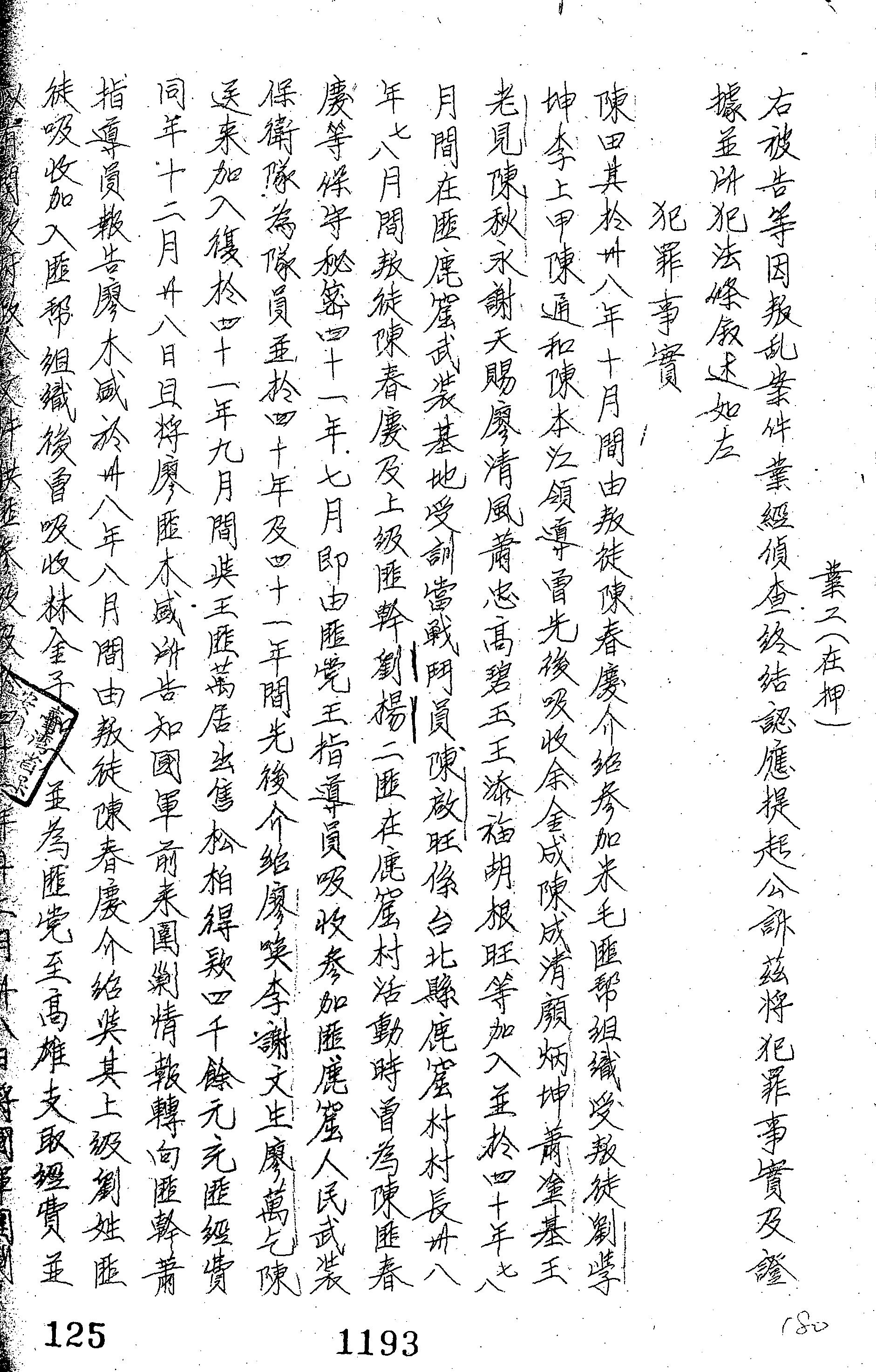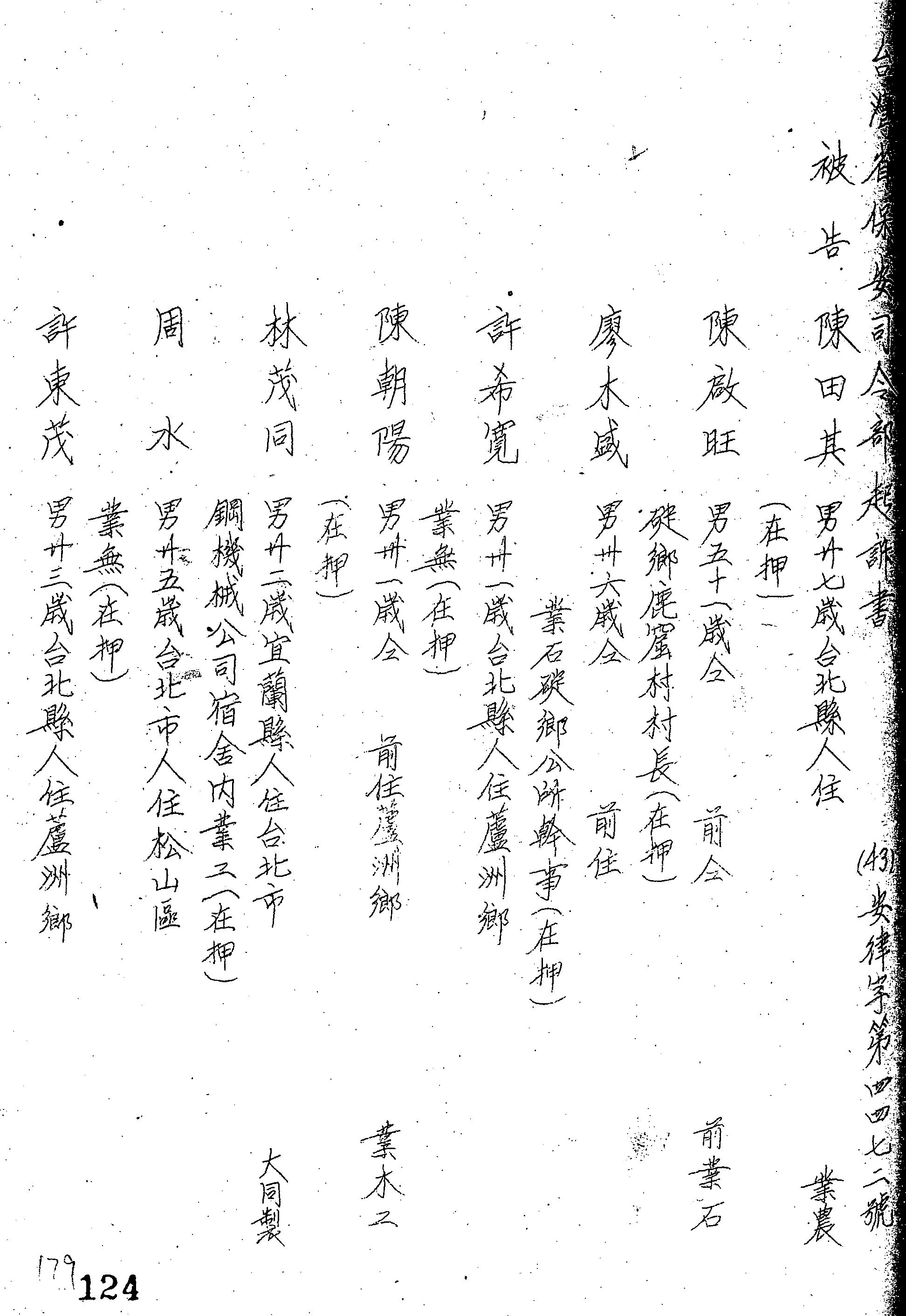 裁判書主文/要旨:陳田其等因叛亂案件業經偵查終結認應提起公訴。
