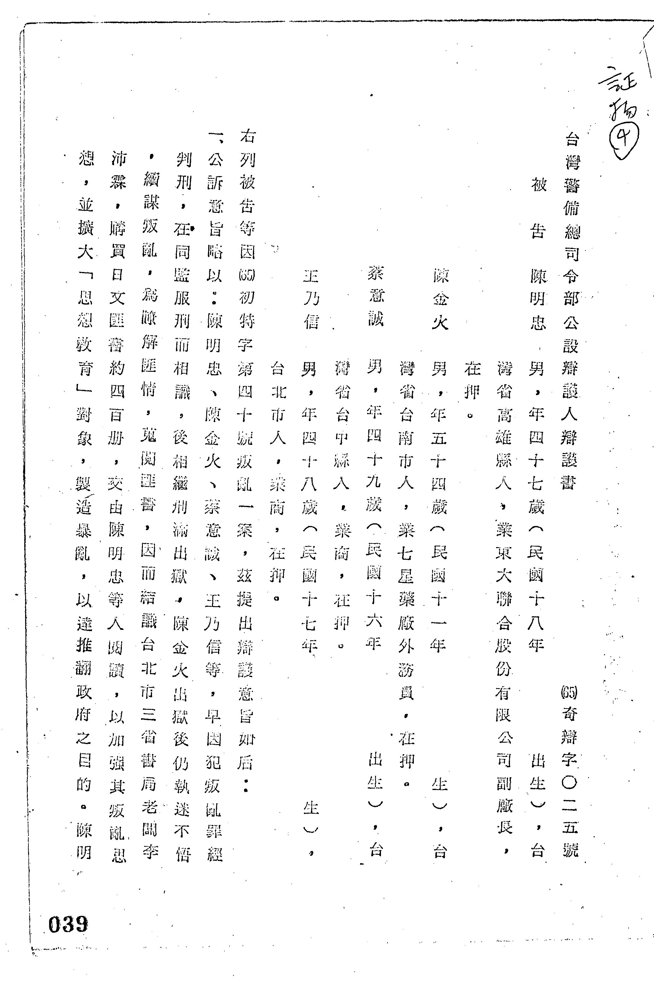 臺灣警備總司令部65年奇辯字第0025號公設辯護人辯護書