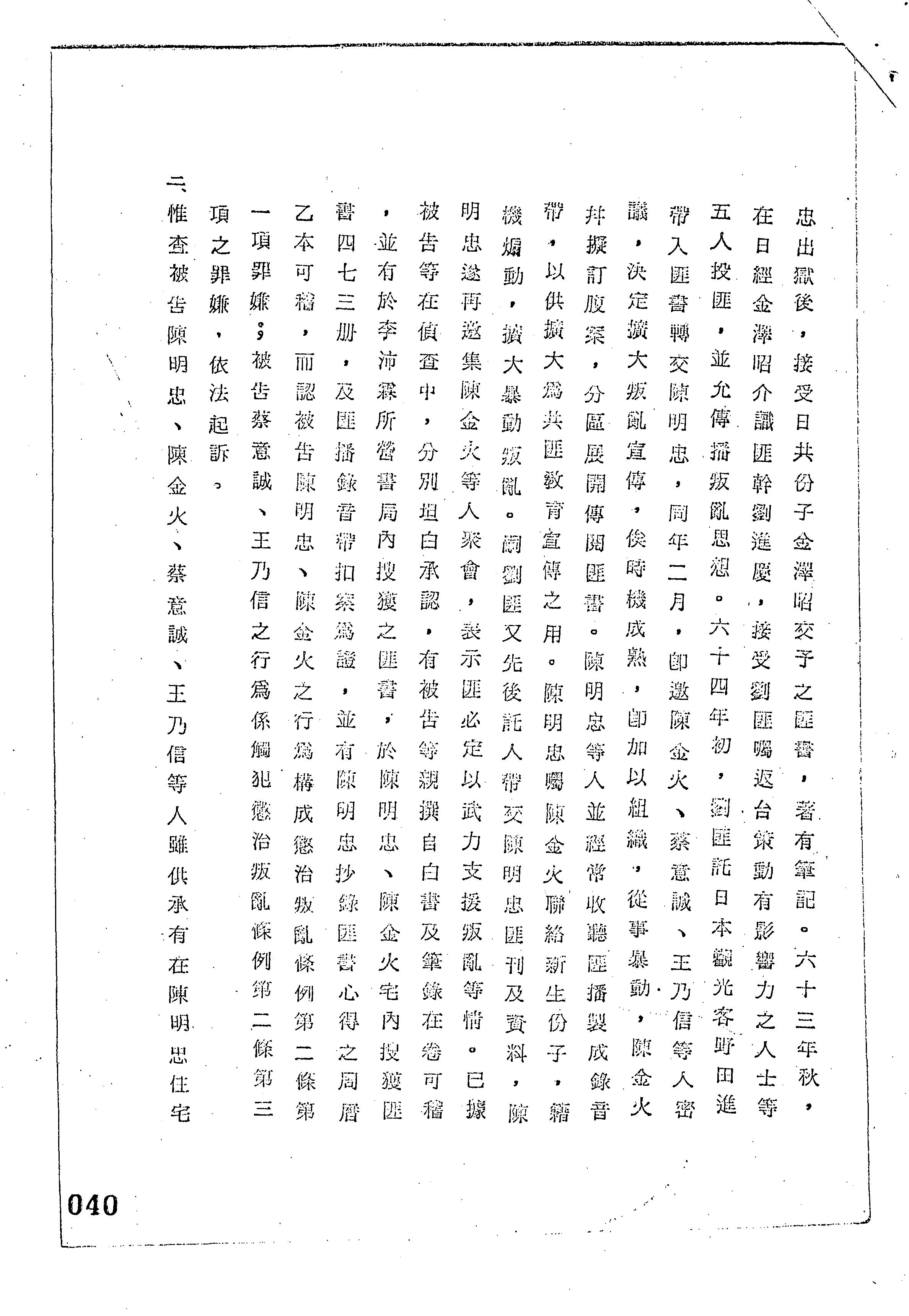裁判書主文/要旨:就陳明忠等因(65)初特字第四十號叛亂一案提出辯護。