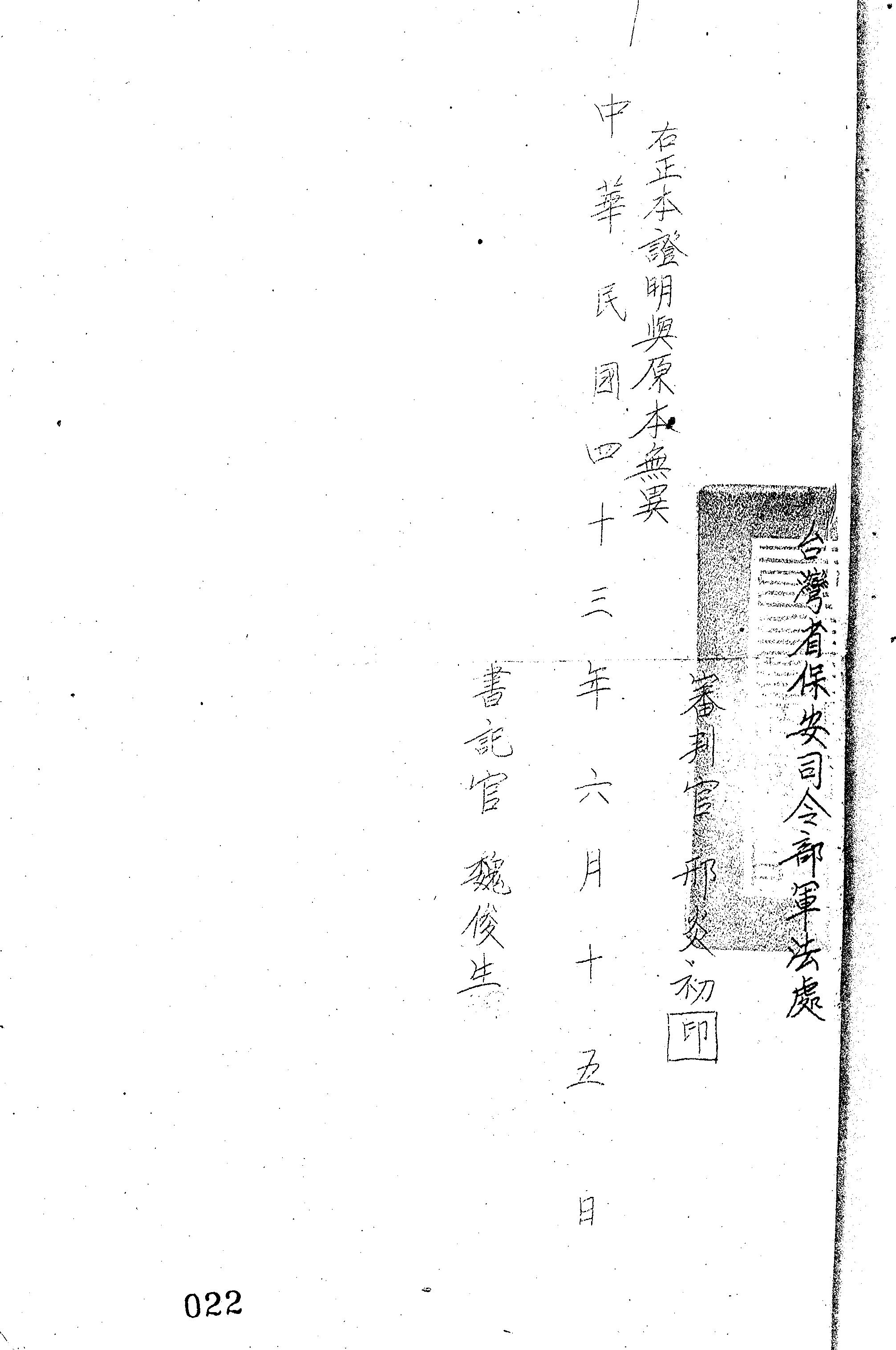 - 裁判書正題名: 臺灣省保安司令部43年安御字第0775號裁定書