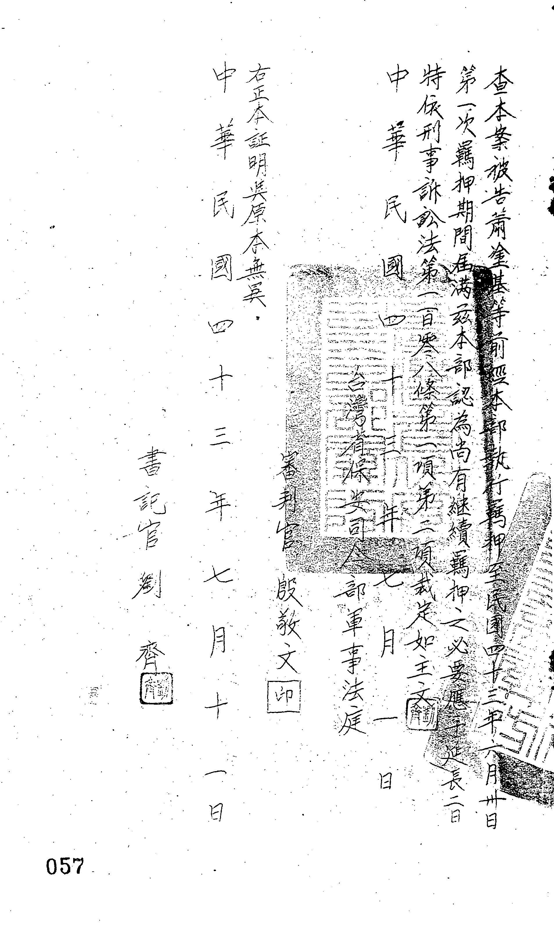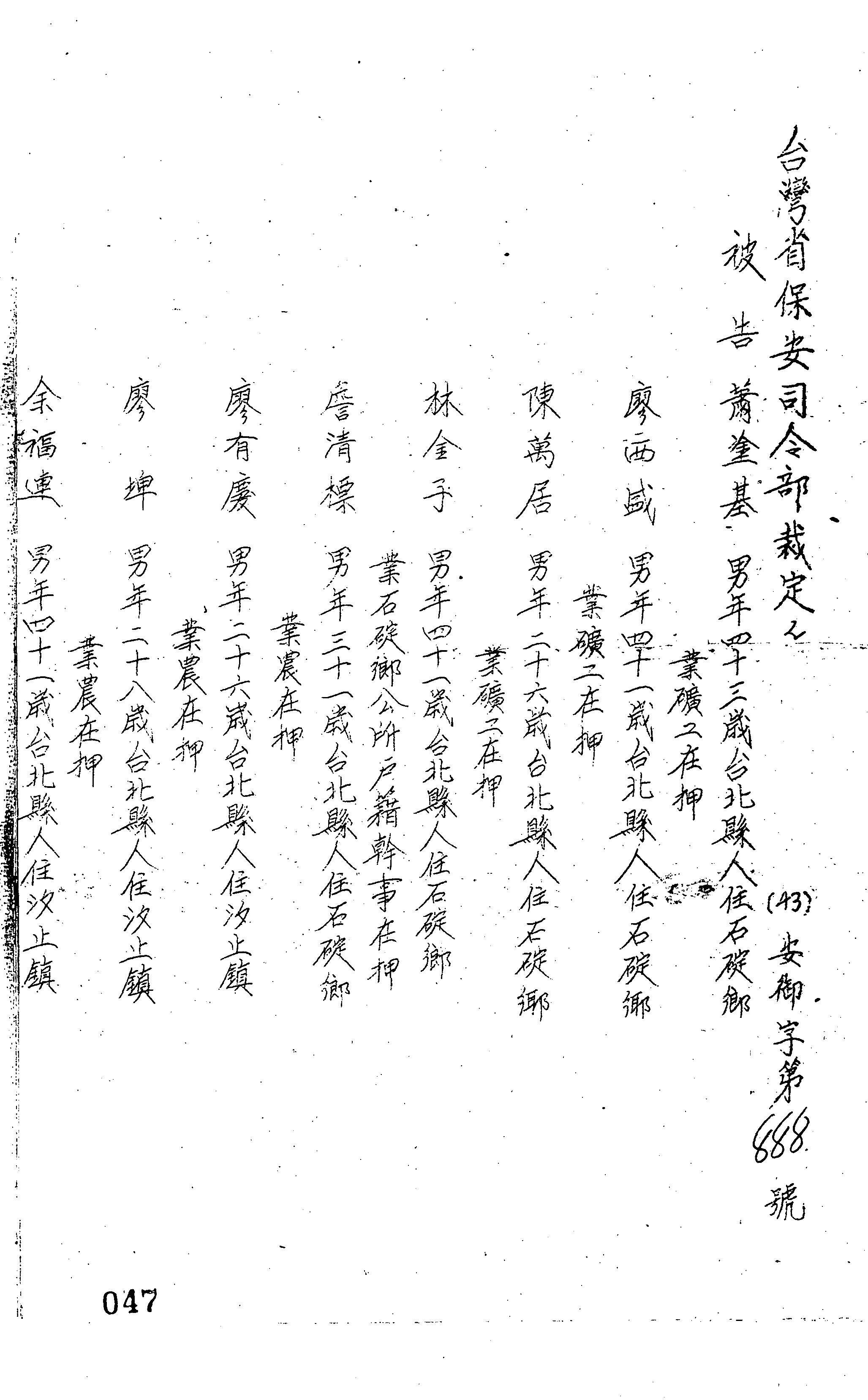 - 裁判書正題名: 臺灣省保安司令部43年安御字第0888號裁定書