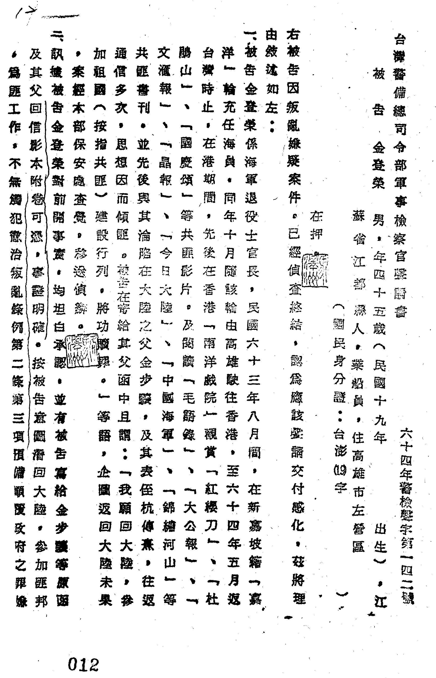 裁判書主文/要旨:金登榮因叛亂嫌疑案件已經偵查終結,認應聲請交付感化。