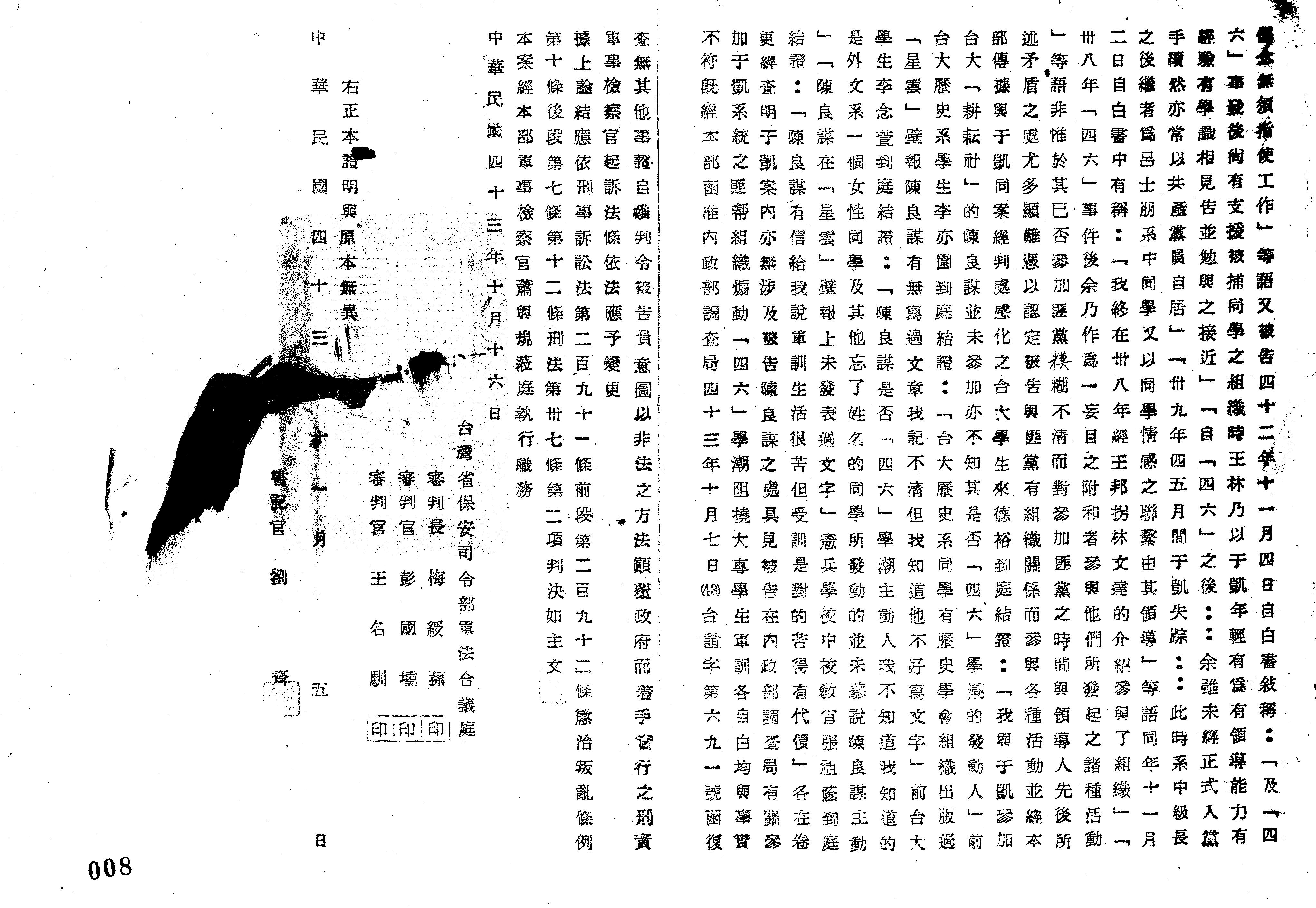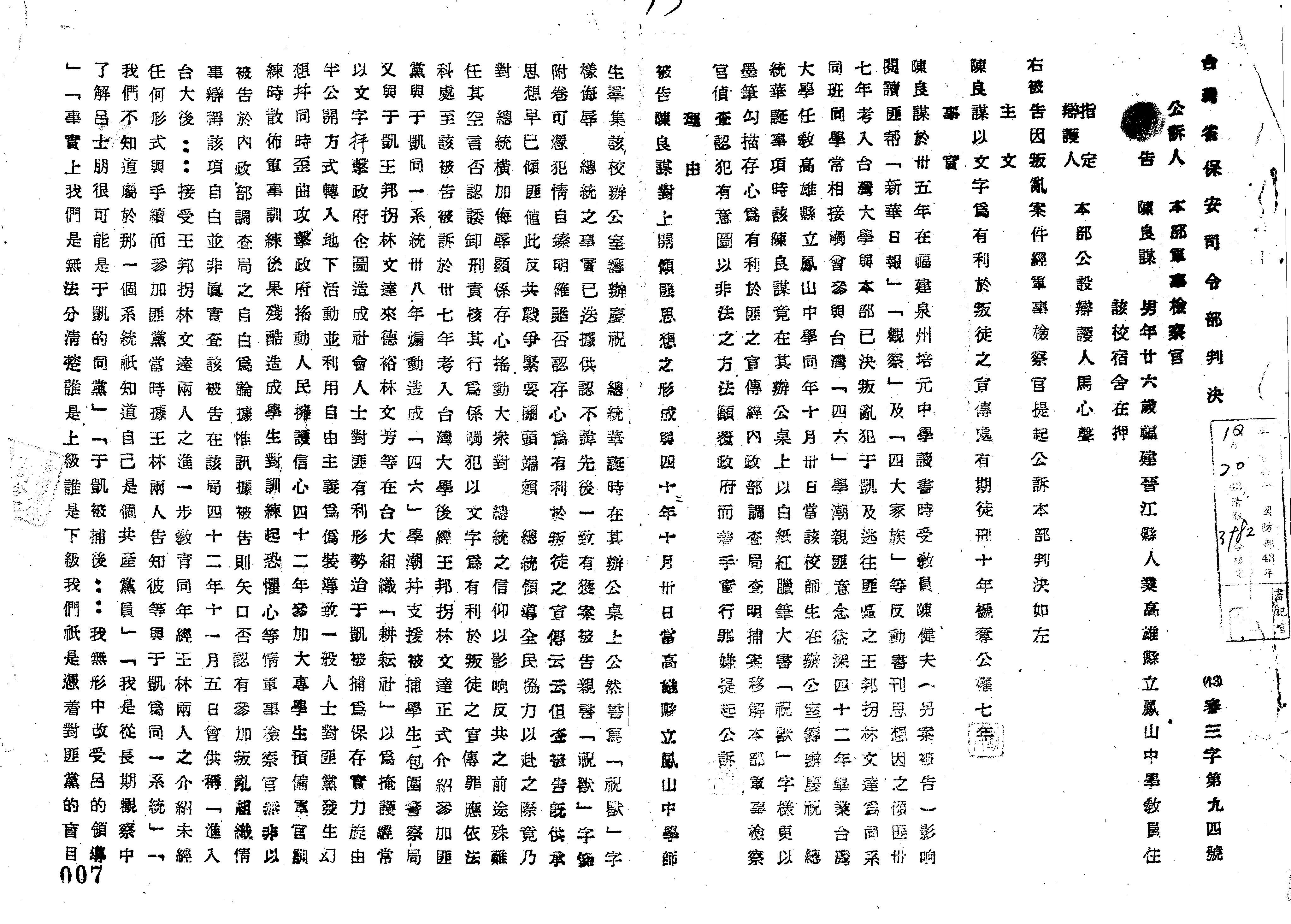 法條:刑事訴訟法第291條前段、第292條;懲治叛亂條例第10條後段、第7條、第12條;刑法第37條第2項