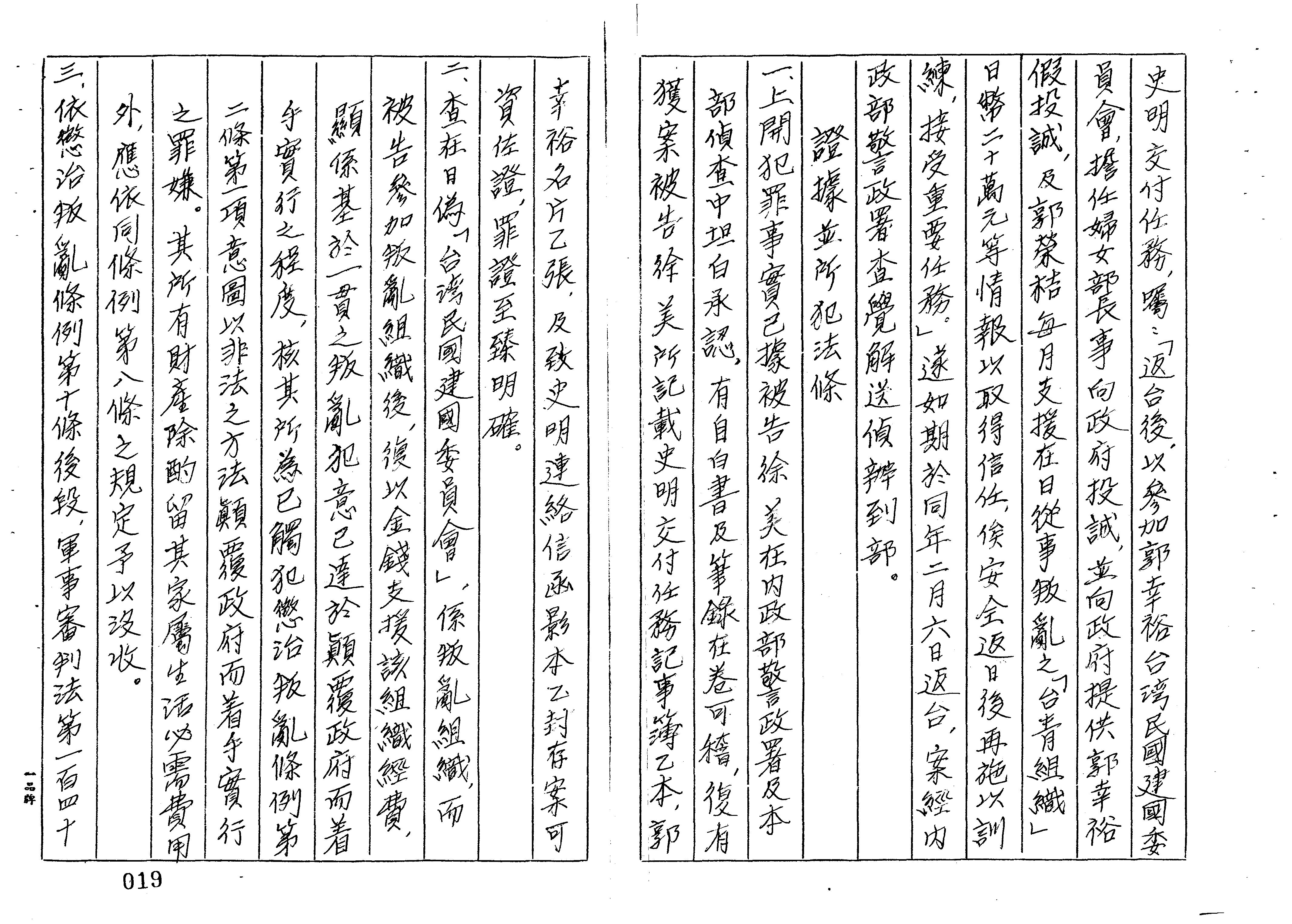 裁判書主文/要旨:徐美因叛亂嫌疑案件業經偵查終結認應提起公訴。