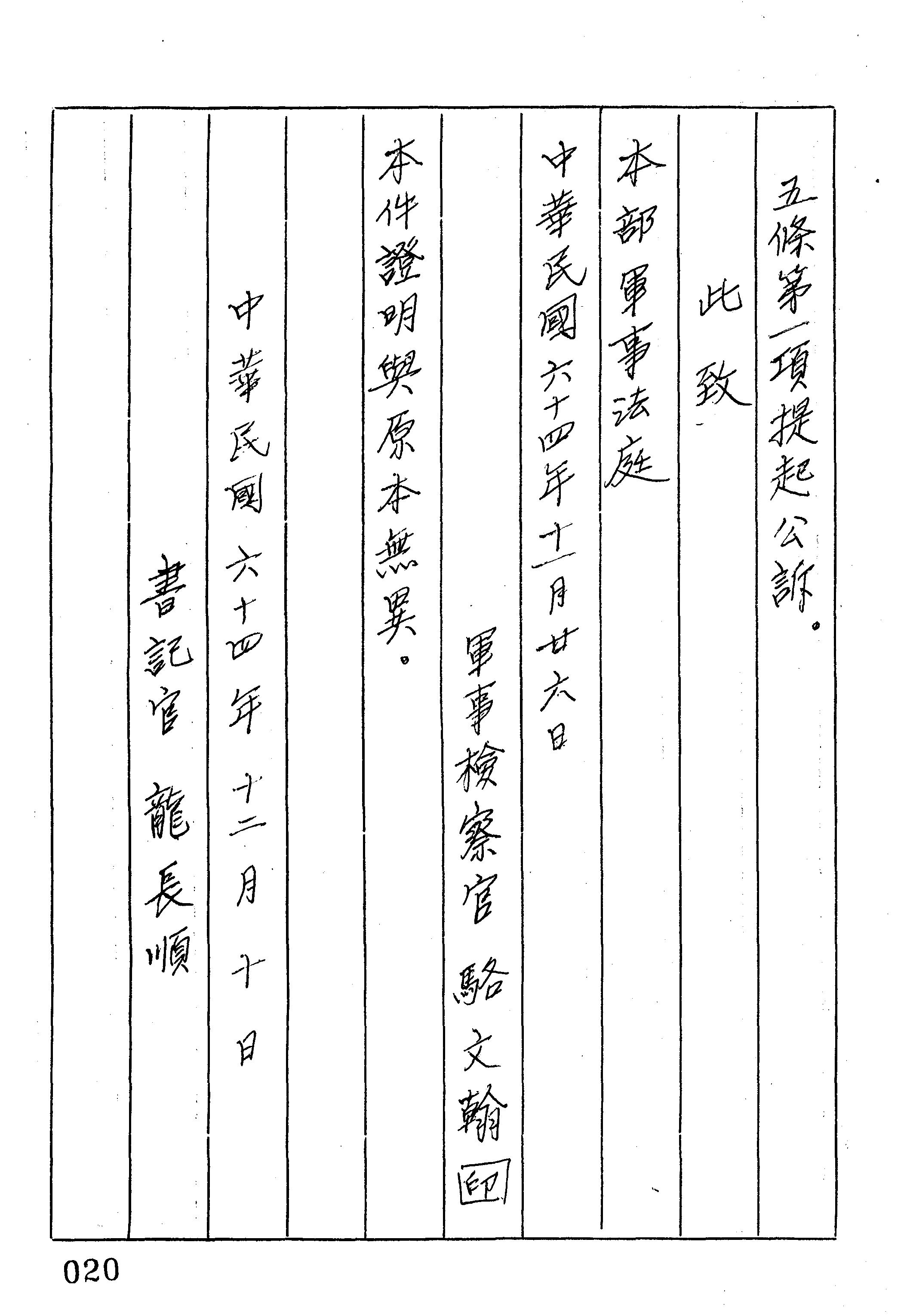 臺灣警備總司令部64年警檢訴字第0215號軍事檢察官起訴書
