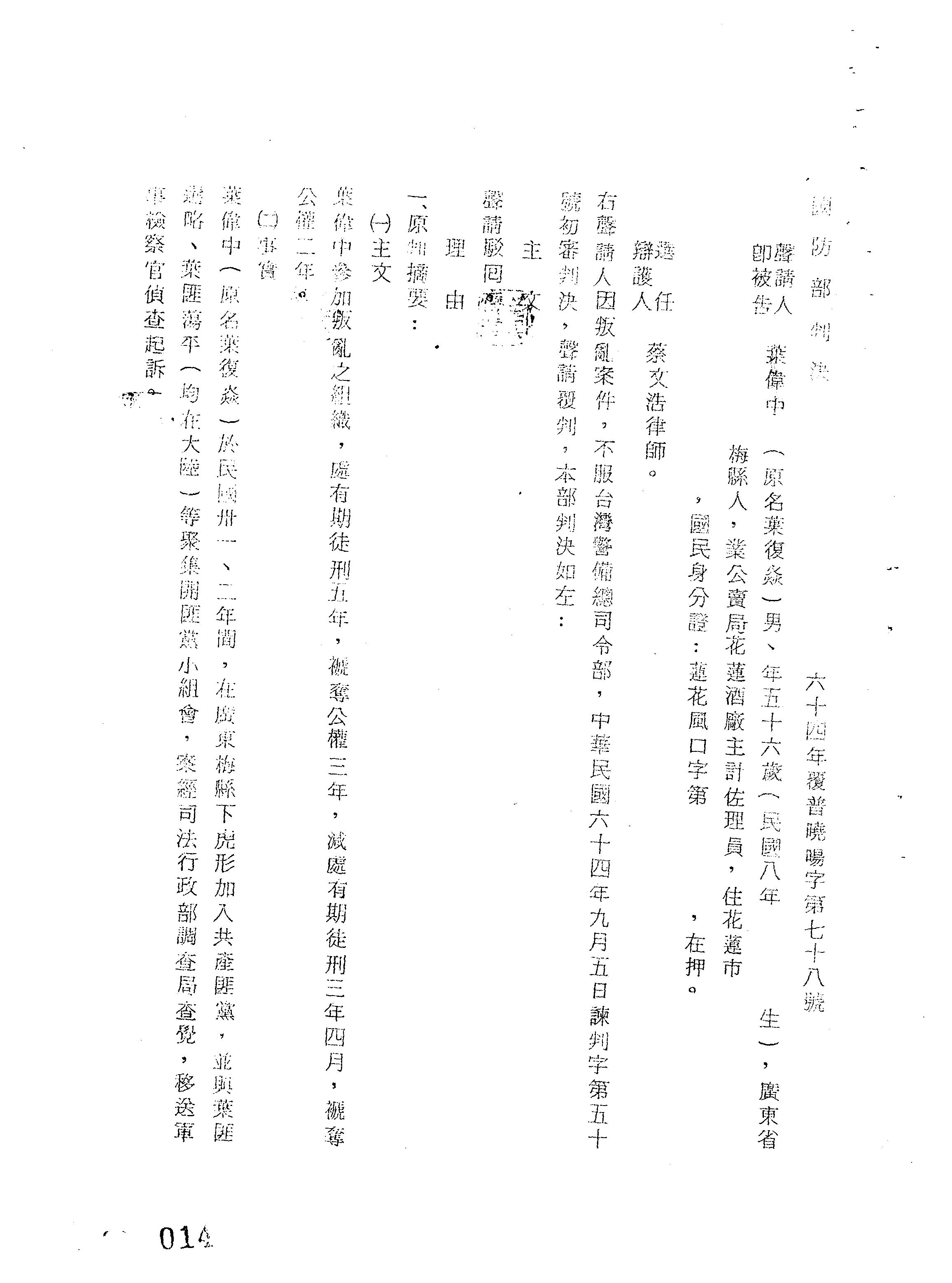國防部64年覆普曉暘字第0078號判決書