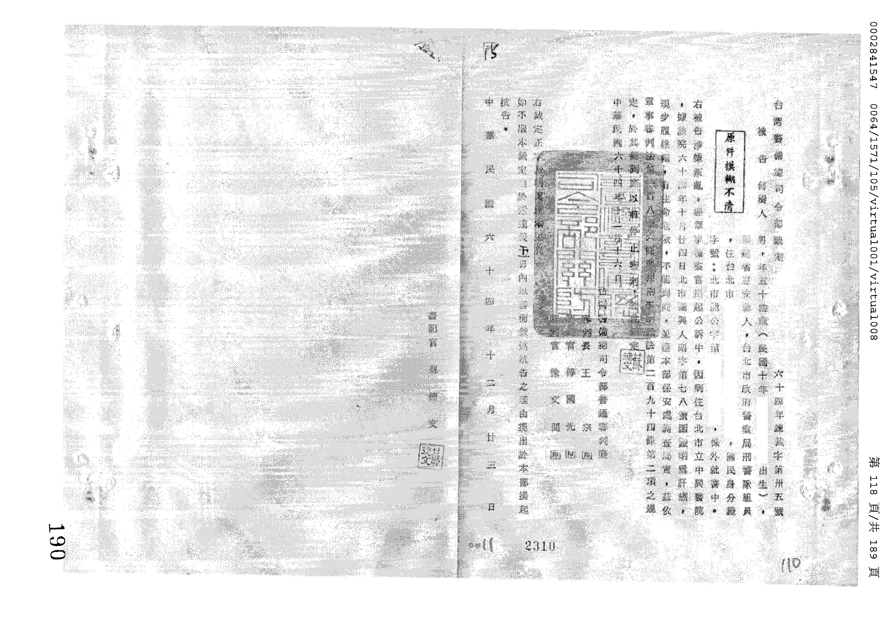 臺灣警備總司令部64年諫裁字第0035號裁定書