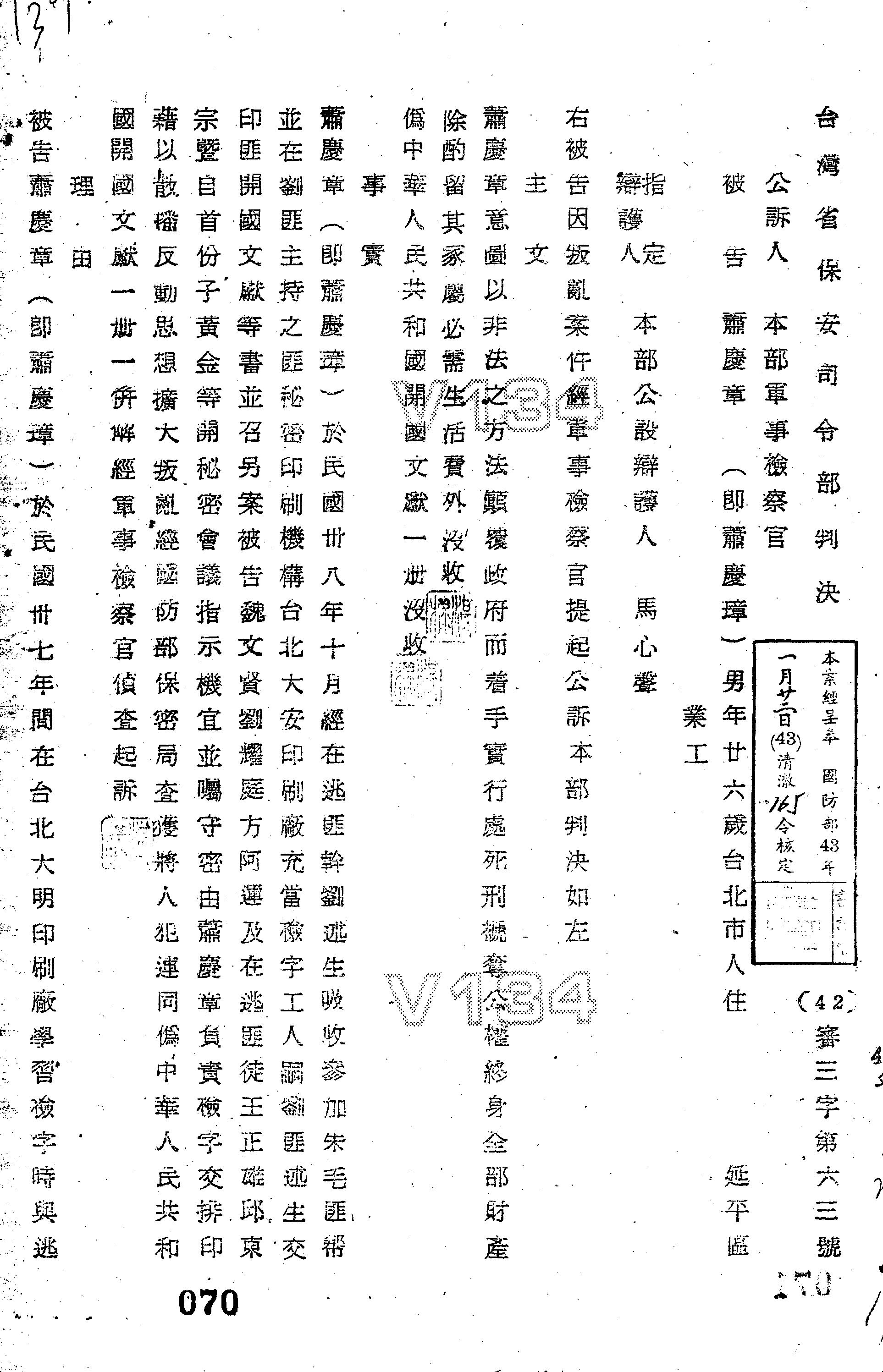 裁判書主文/要旨:蕭慶章「意圖以非法之方法顛覆政府而著手實行」處死刑,褫奪公權終身,全部財產除酌留其家屬必需生活費外沒收,偽中華人民共和國開國文獻1冊沒收。