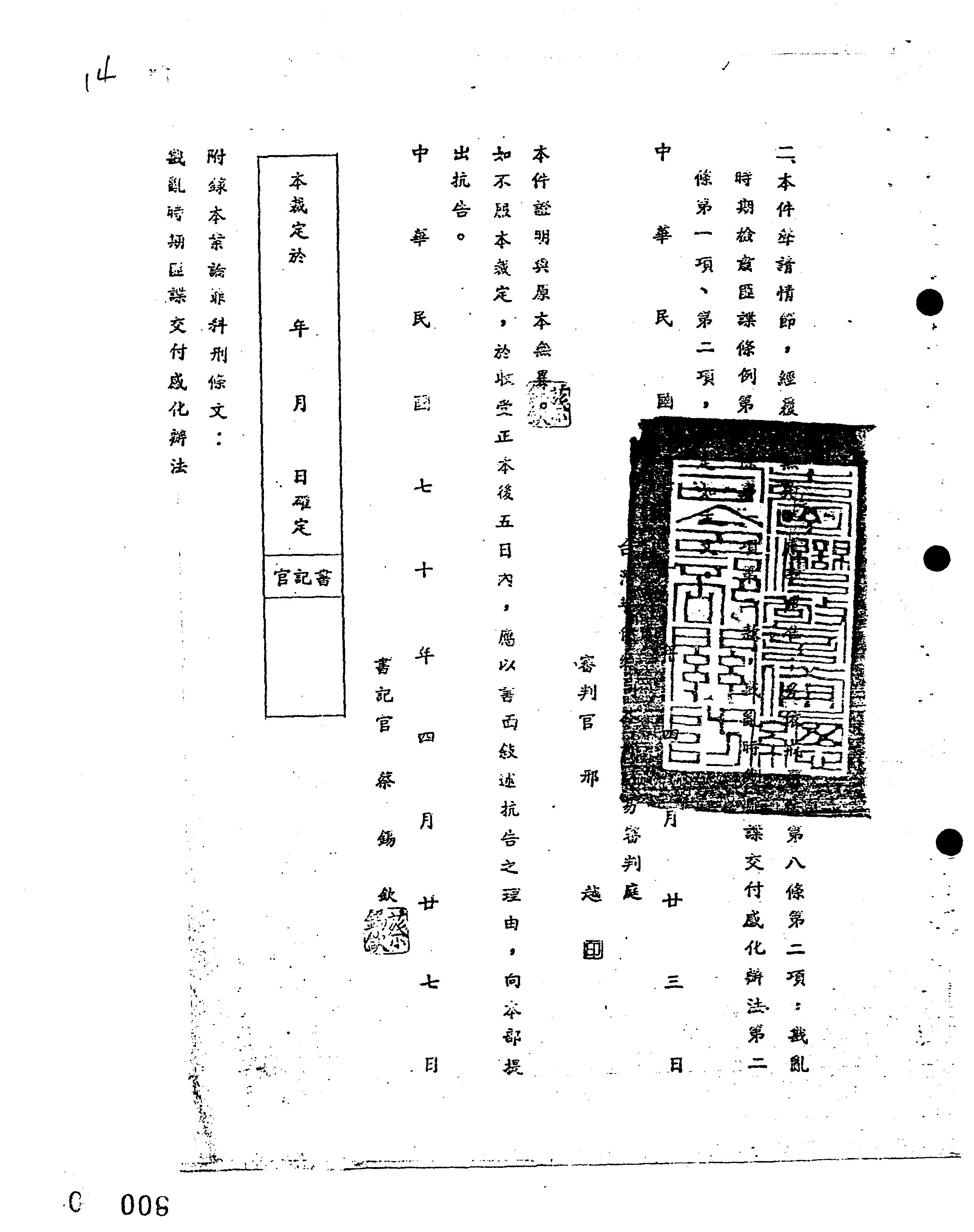 臺灣警備總司令部70年障裁字第0013號裁定書