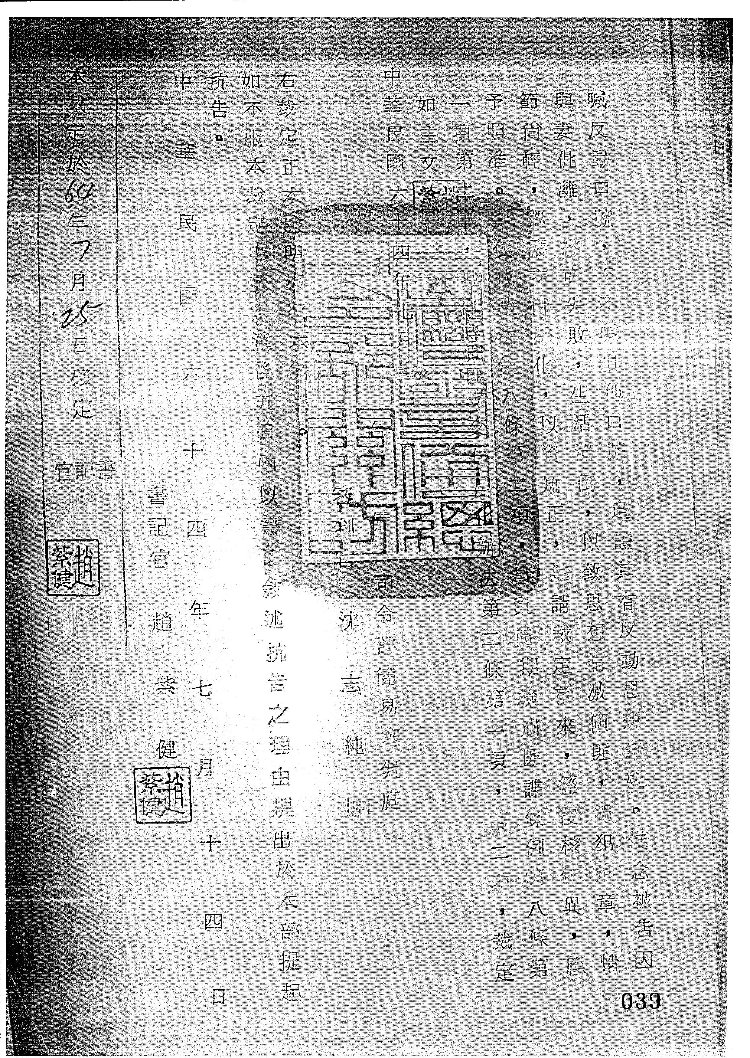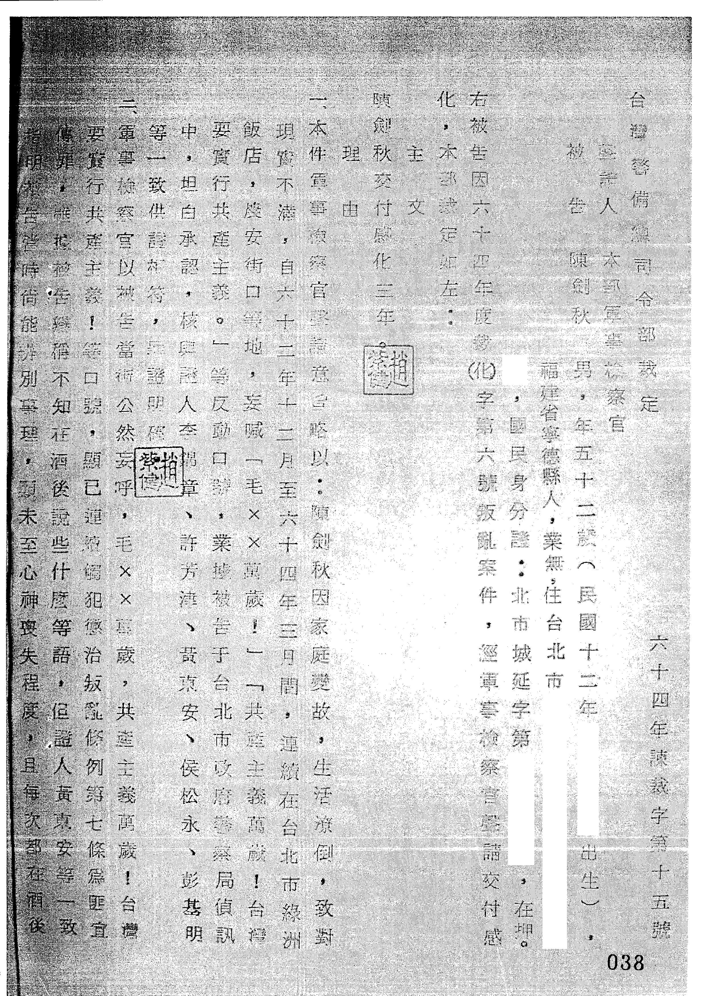 臺灣警備總司令部64年諫裁字第0015號裁定書