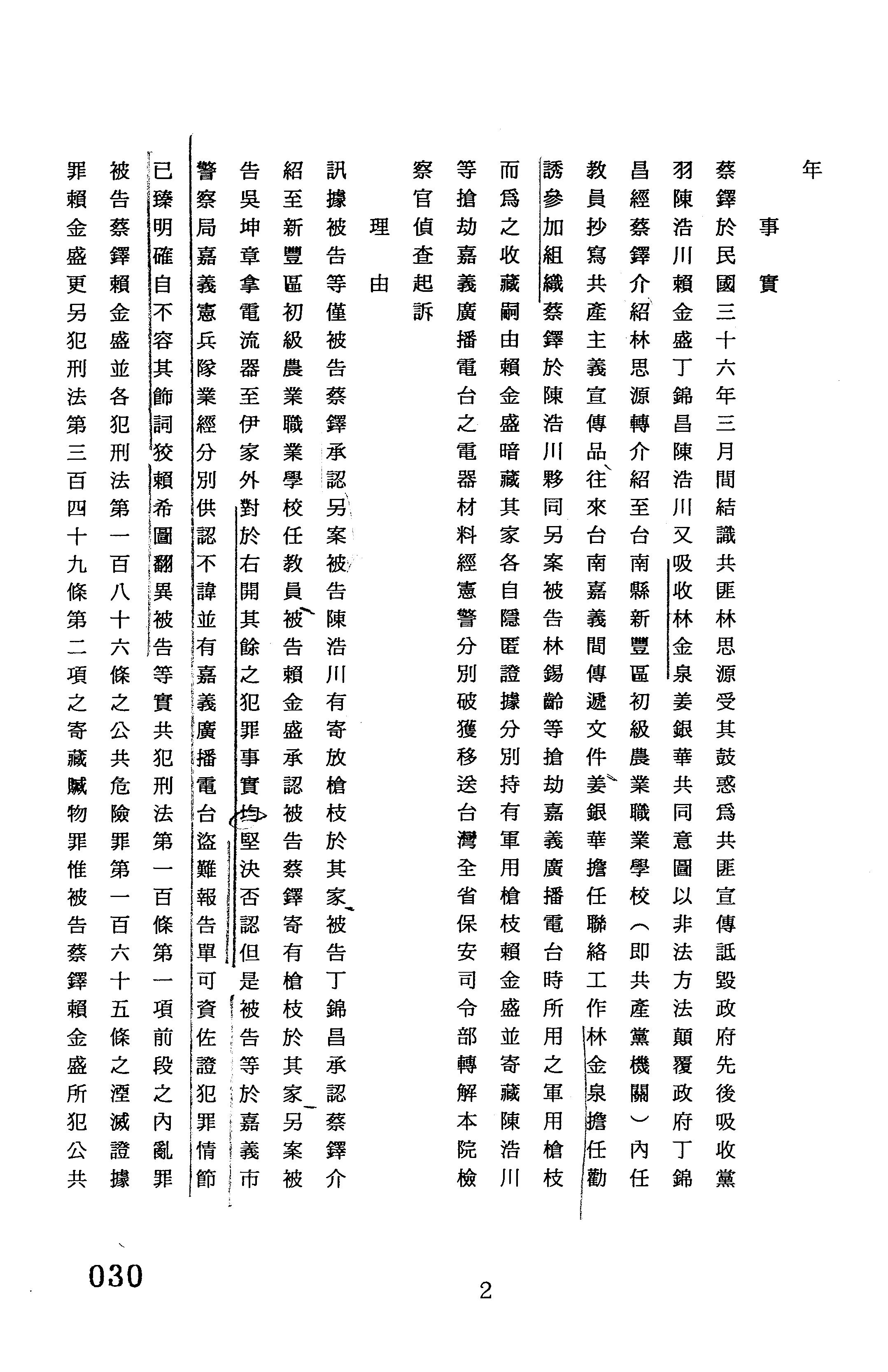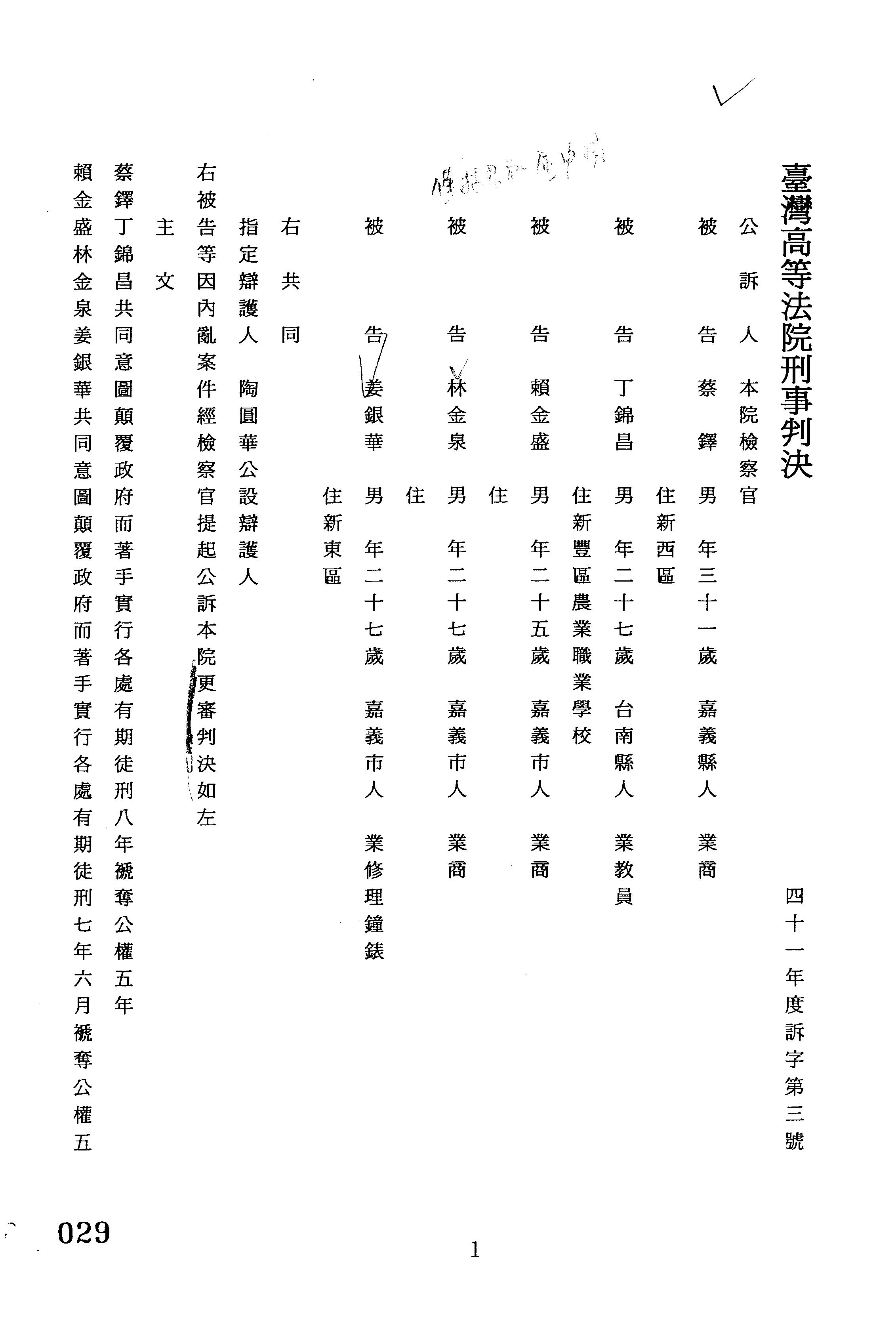 - 裁判書主文/要旨:蔡鐸、丁錦昌「共同意圖顛覆政府而著手實行」各處有期徒刑8年,褫奪公權5年。賴金盛、林金泉、姜銀華「共同意圖顛覆政府而著手實行」各處有期徒刑7年6月,褫奪公權5年。