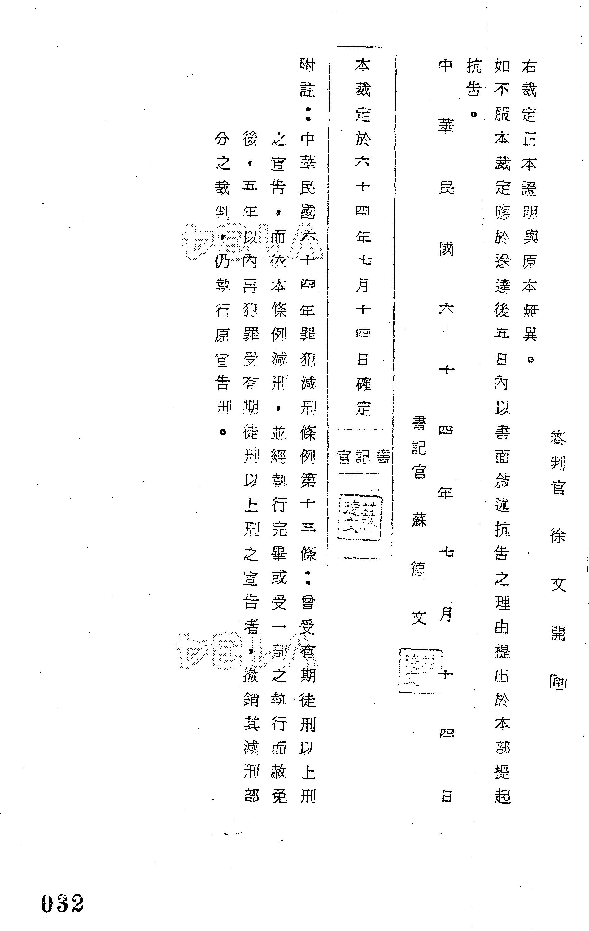 臺灣警備總司令部64年諫減字第0428號裁定書