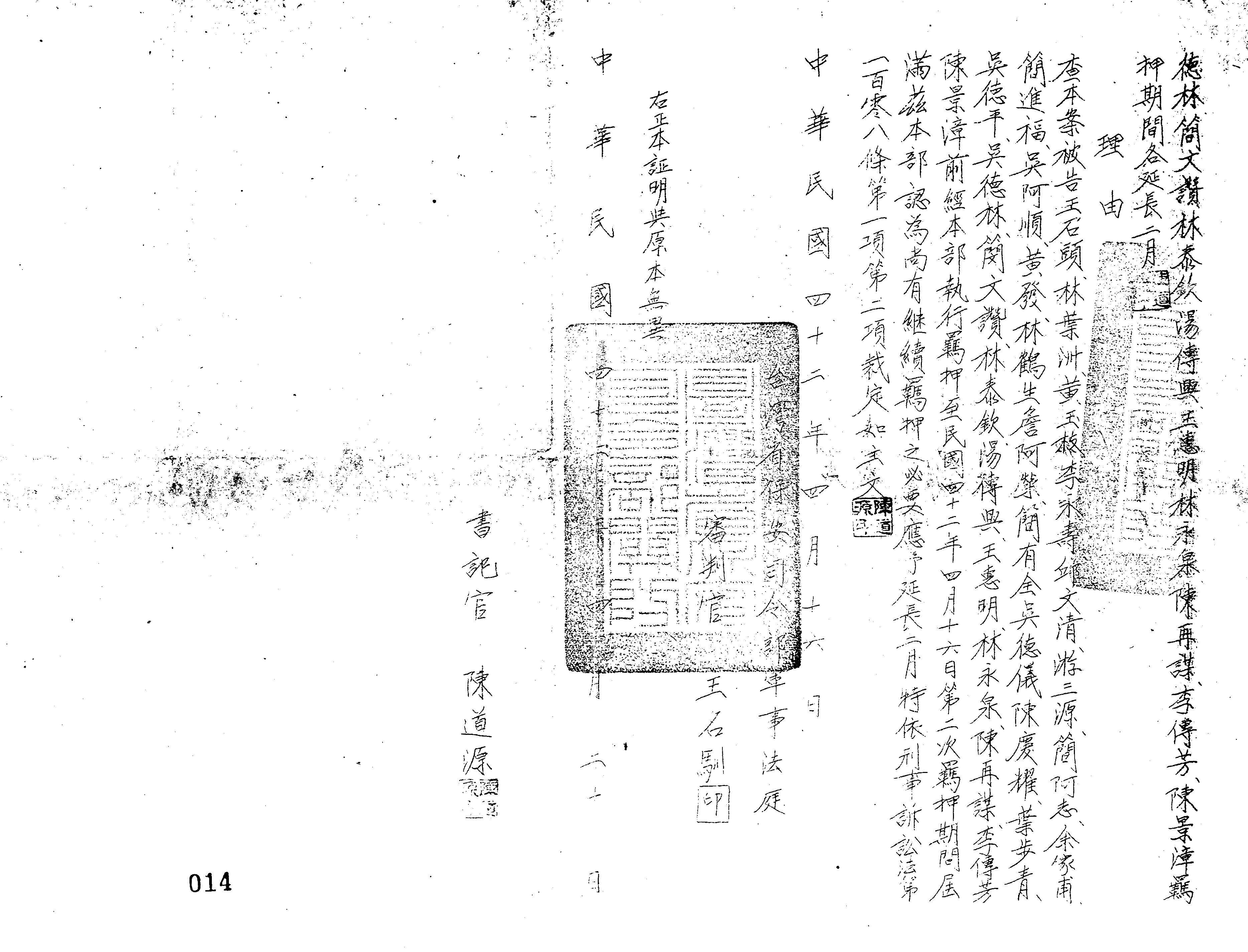 - 裁判書主文/要旨:王石頭、林葉洲、黃玉枝、李永壽、邱文清、游三源、簡阿志、余家甫、簡進福、吳阿順、黃發、林鶴生、詹阿榮、簡有全、吳德儀、陳慶耀、葉步青、吳德平、吳德林、簡文讚、林泰欽、湯傳興、王惠明、林永泉、陳再謀、李傳芳、陳景漳羈押期間各延長2月。