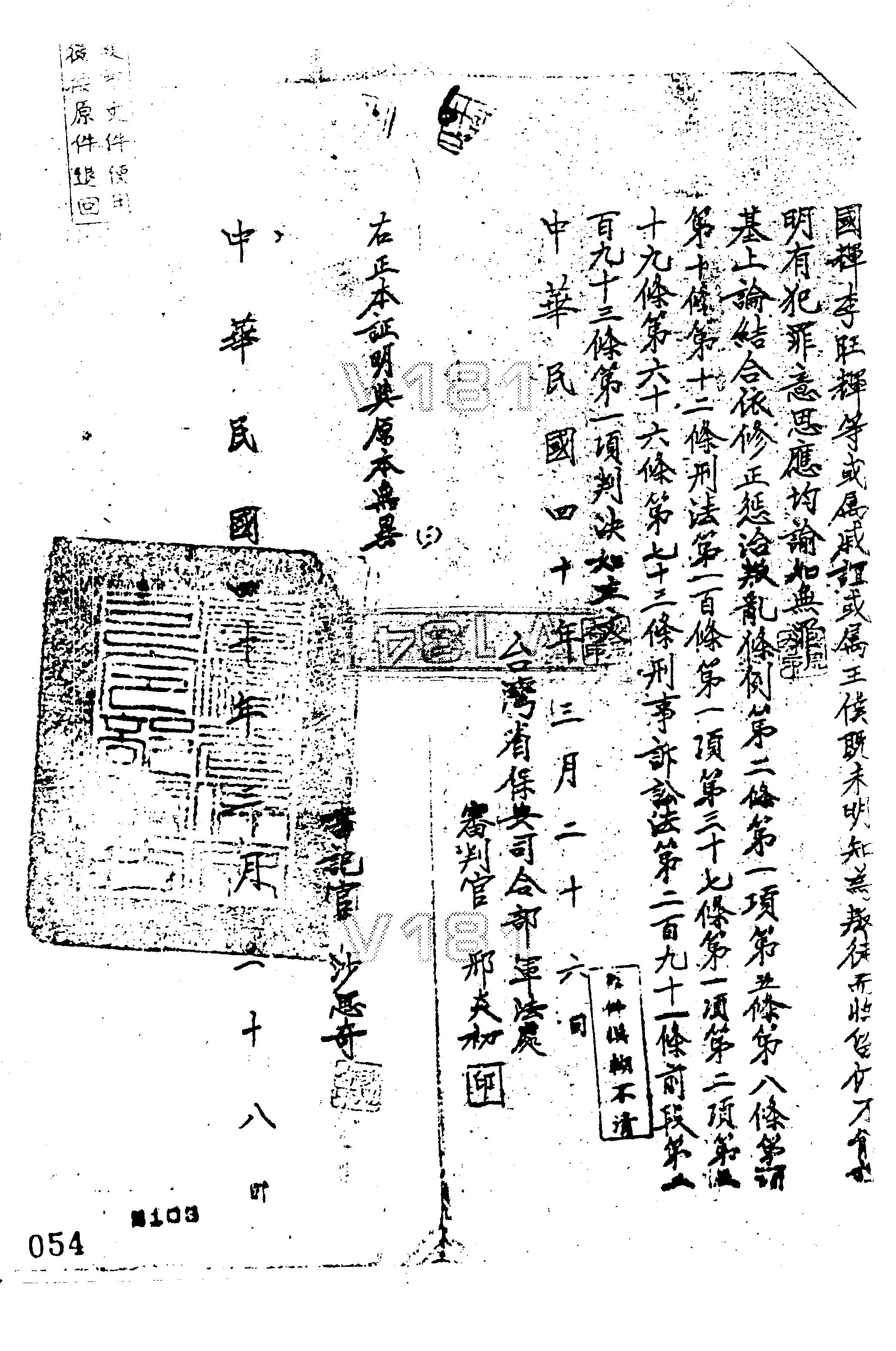 - 法條:修正懲治叛亂條例第2條第1項、第5條、第8條第1項、第10條、第12條;刑法第100條第1項、第37條第1項、第37條第2項、第59條、第66條、第73條;刑事訴訟法第291條前段、第293條第1項