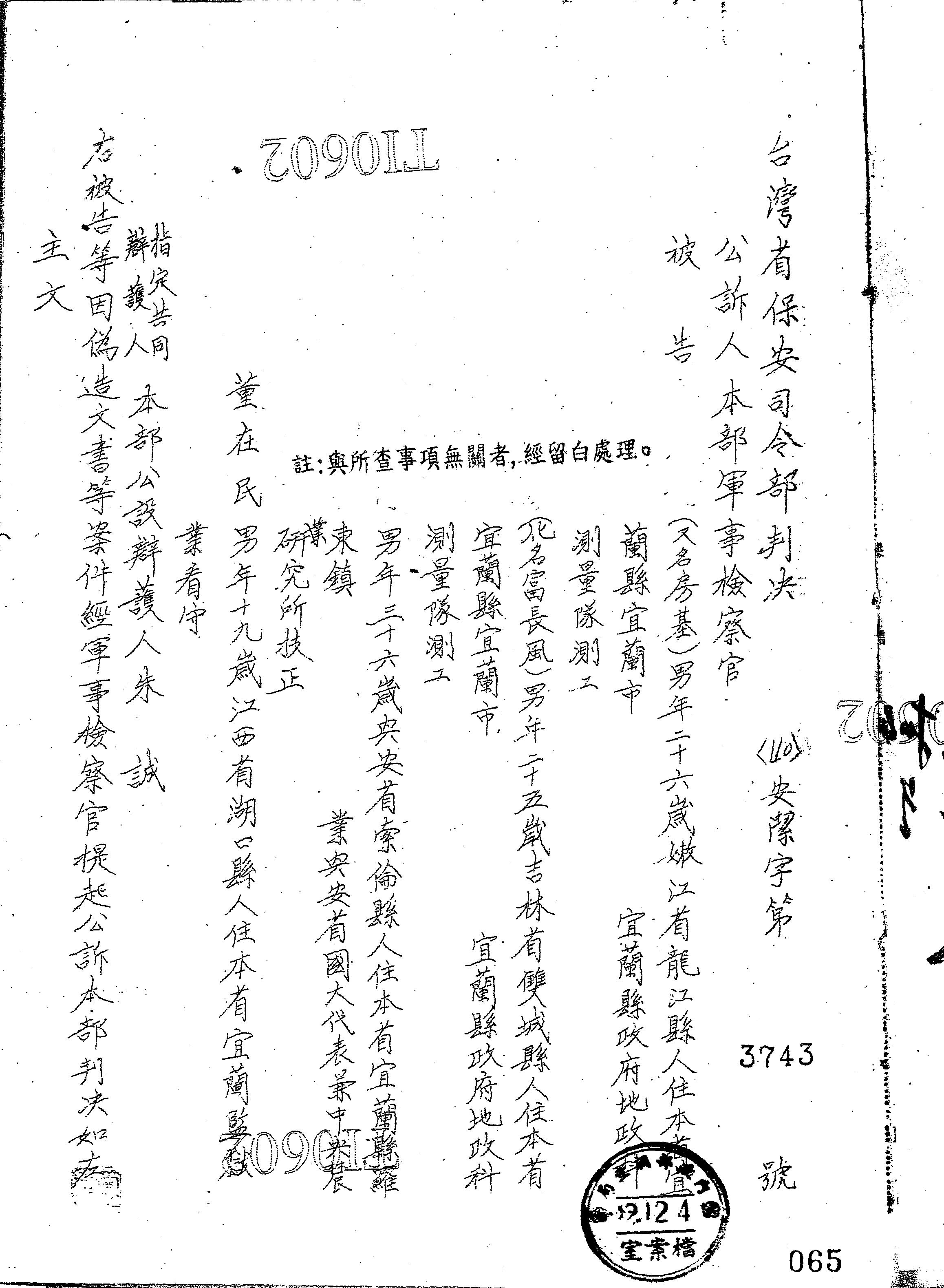 - 裁判書正題名: 臺灣省保安司令部40年安潔字第3743號判決書