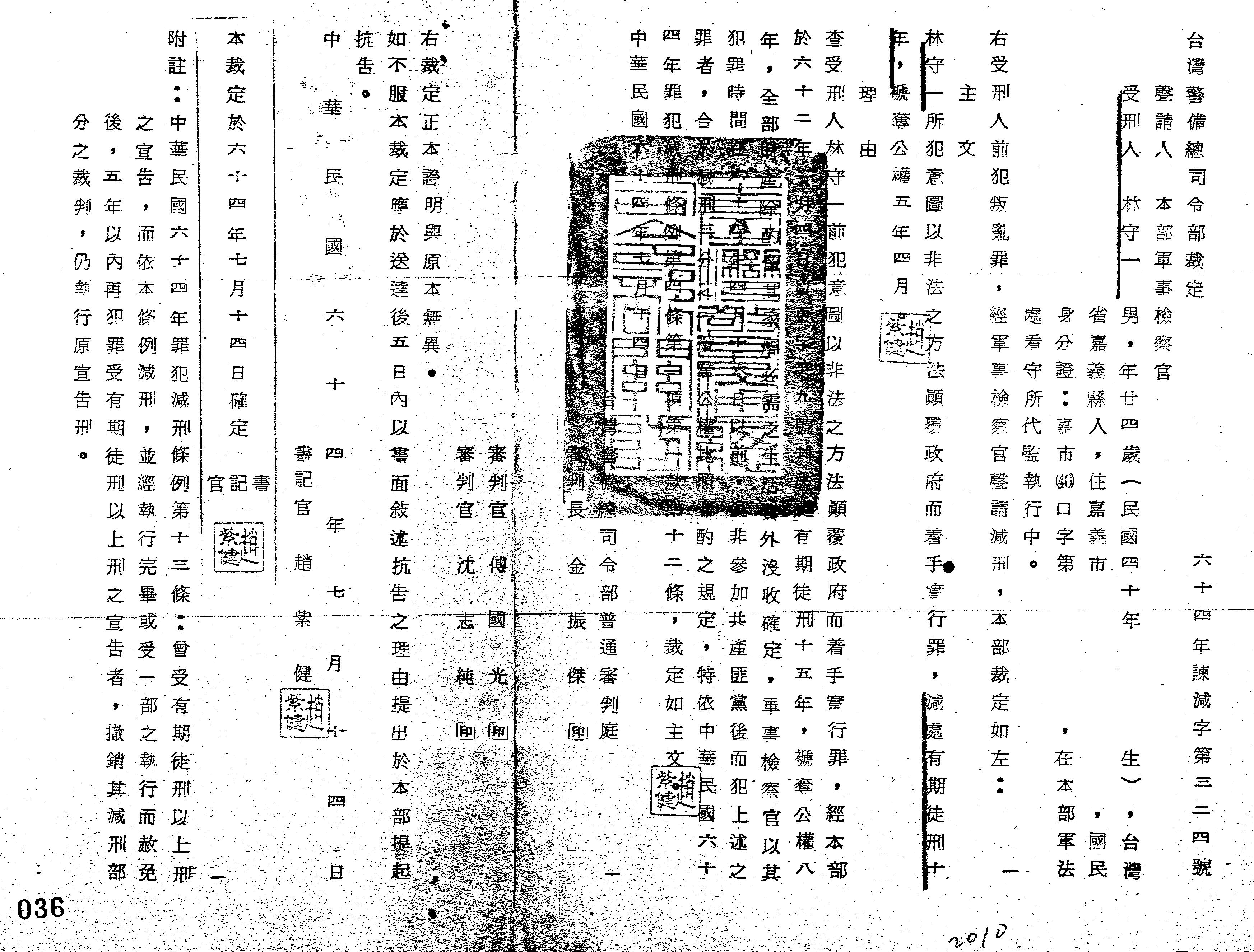 臺灣警備總司令部64年諫減字第0324號裁定書