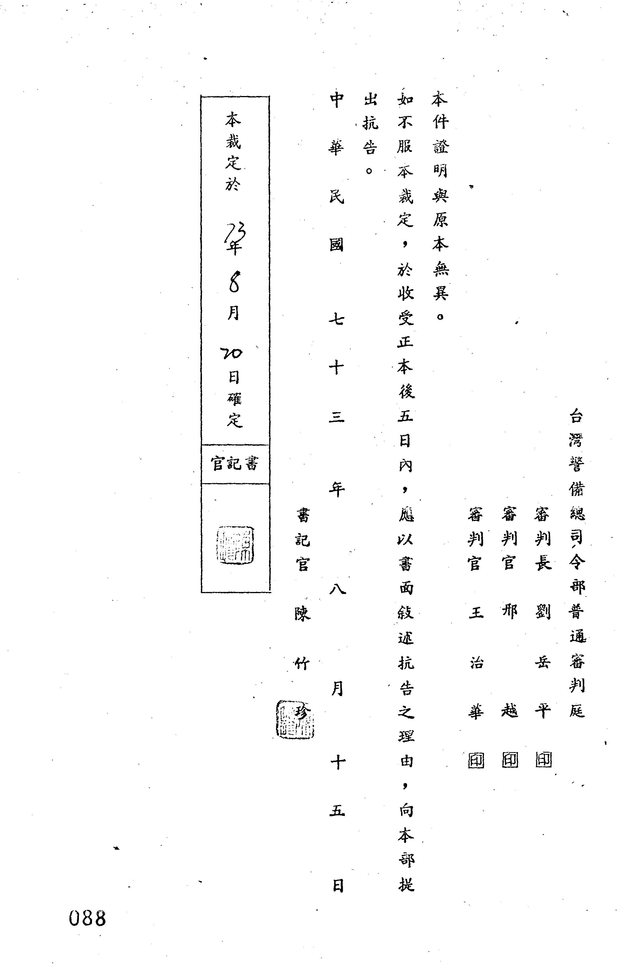 臺灣警備總司令部73年障裁字第0022號裁定書
