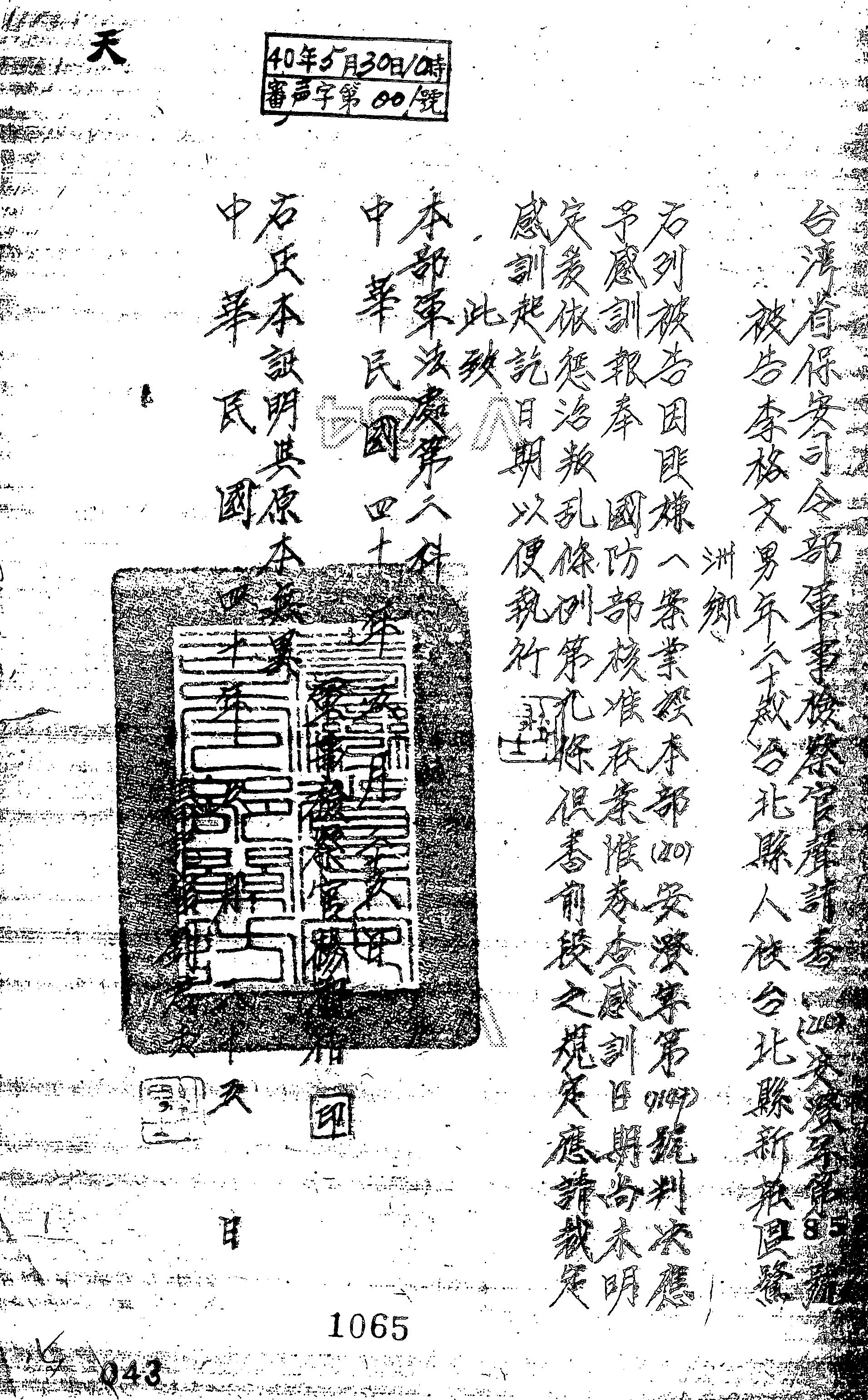 臺灣省保安司令部40年安澄字軍事檢察官聲請書