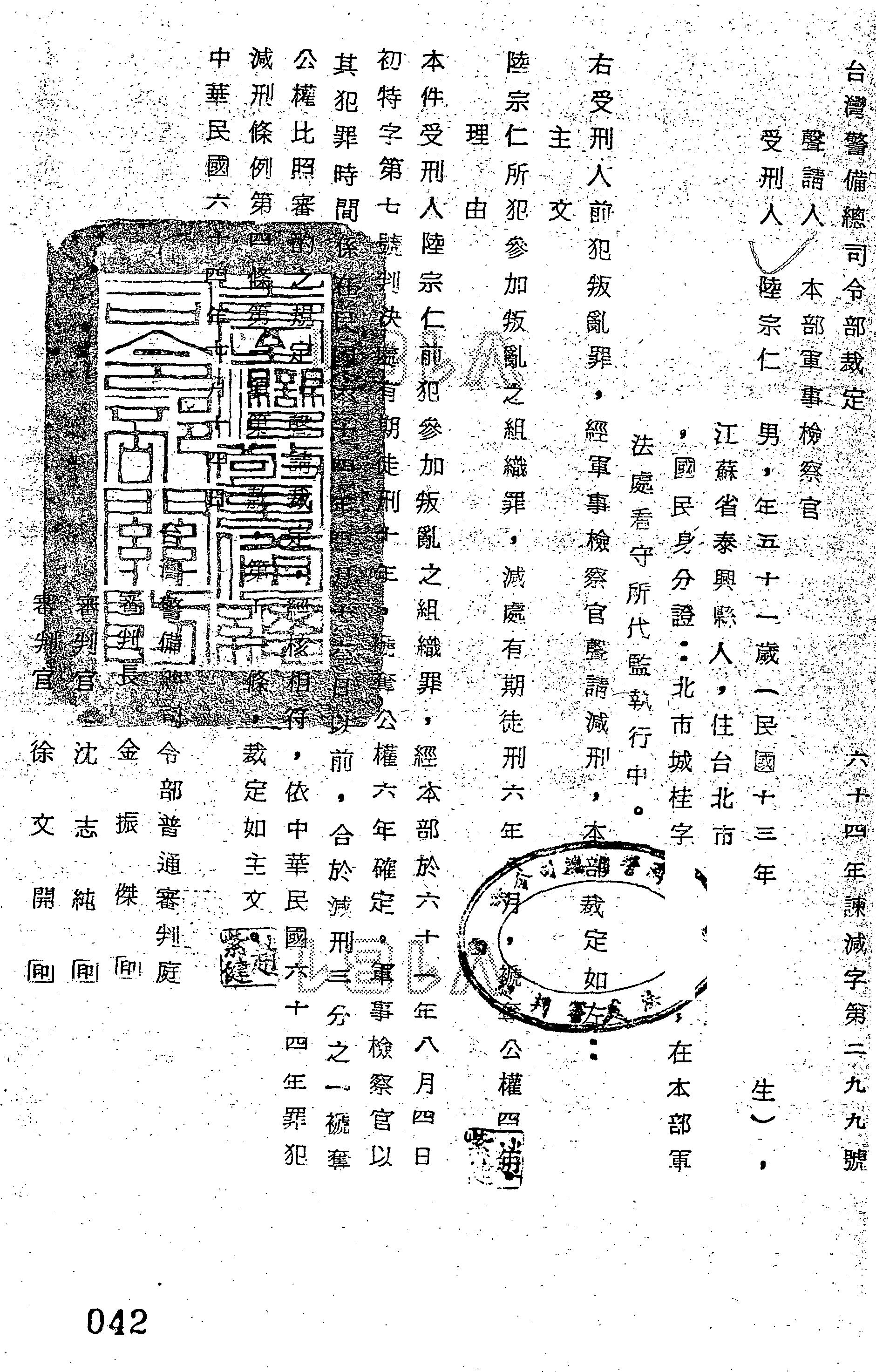 裁判書主文/要旨:陸宗仁所犯「參加叛亂之組織罪」,減處有期徒刑6年8月,褫奪公權4年。