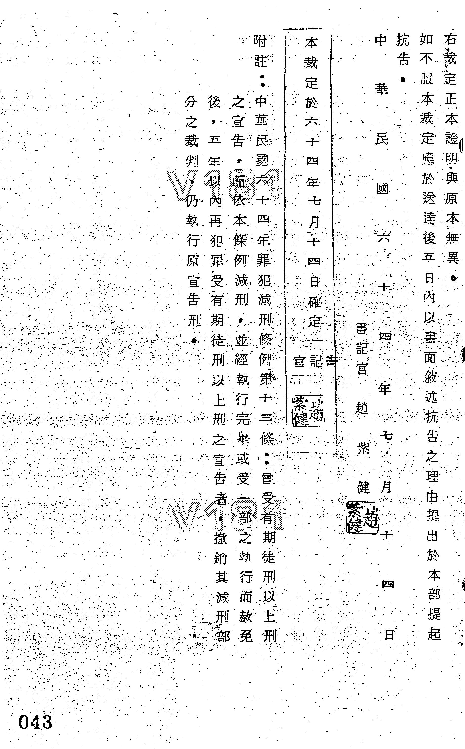 臺灣警備總司令部64年諫減字第0299號裁定書