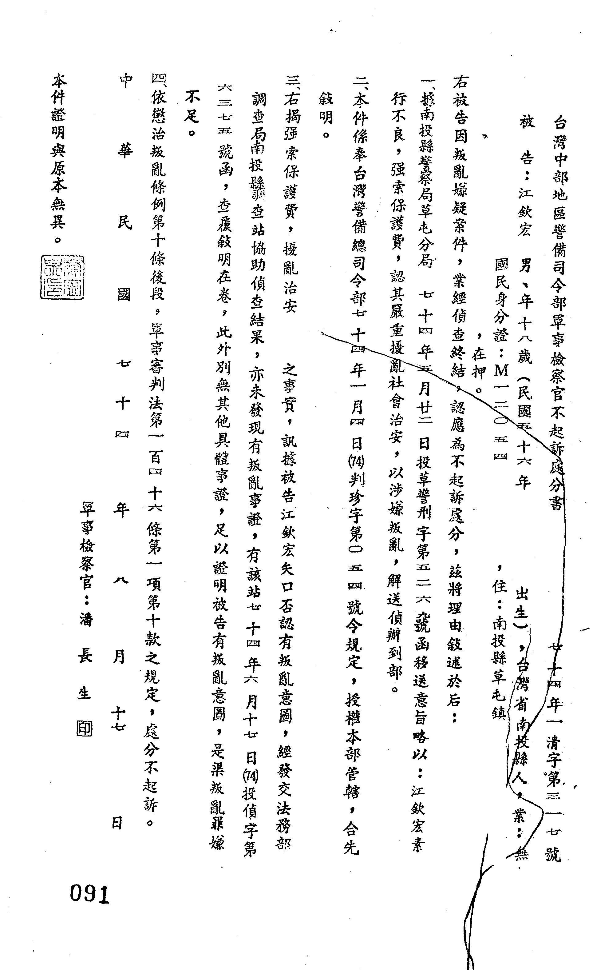 臺灣中部地區警備司令部74年一清字第0317號軍事檢察官不起訴處分書