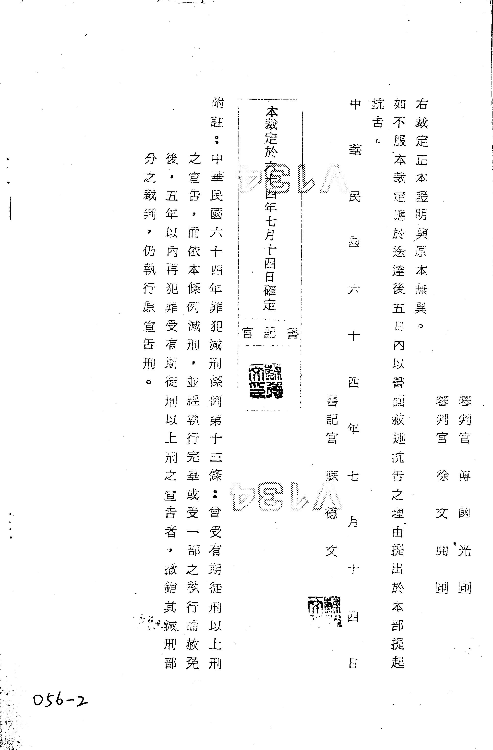 臺灣警備總司令部64年諫減字第0272號裁定書