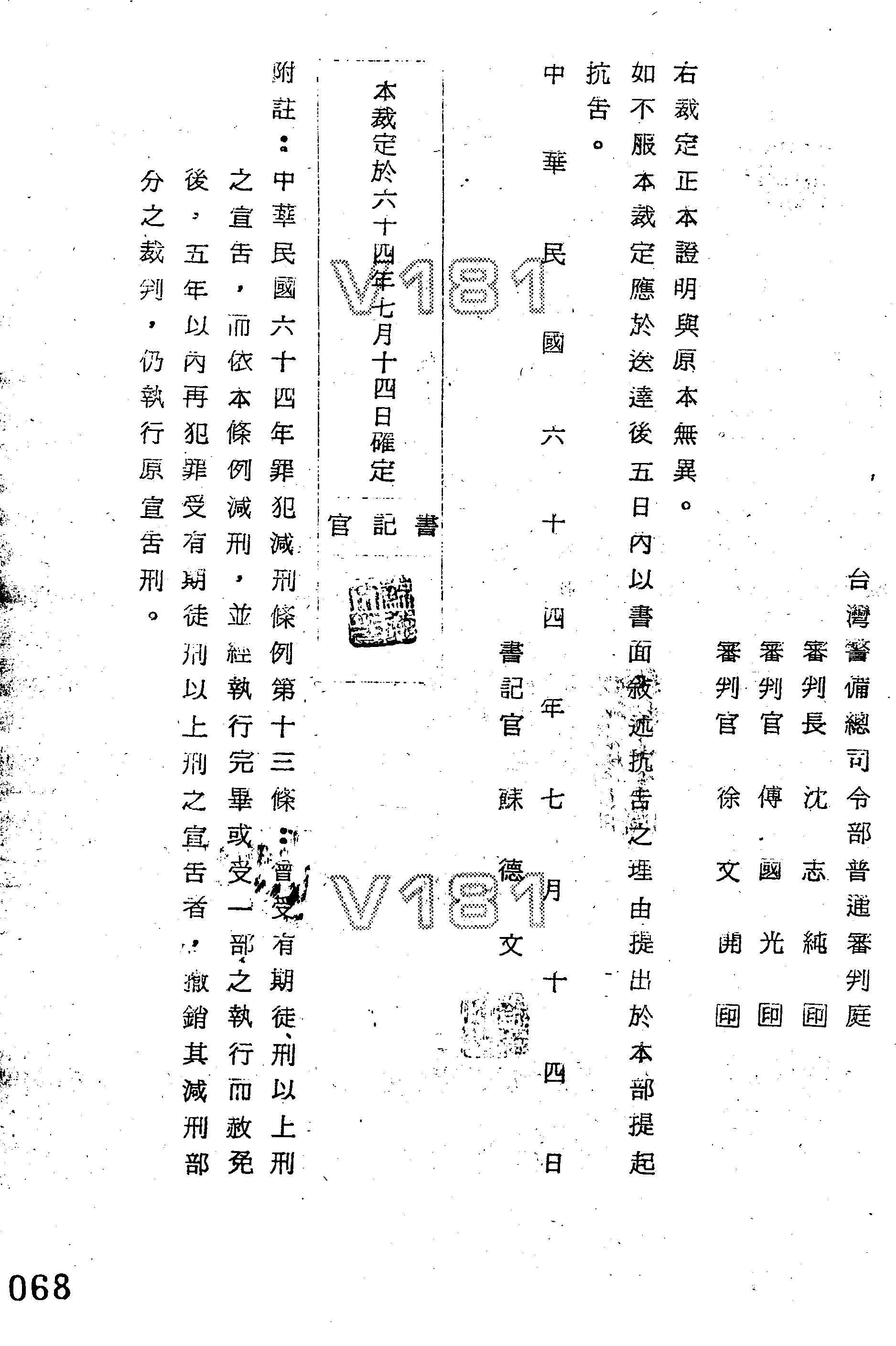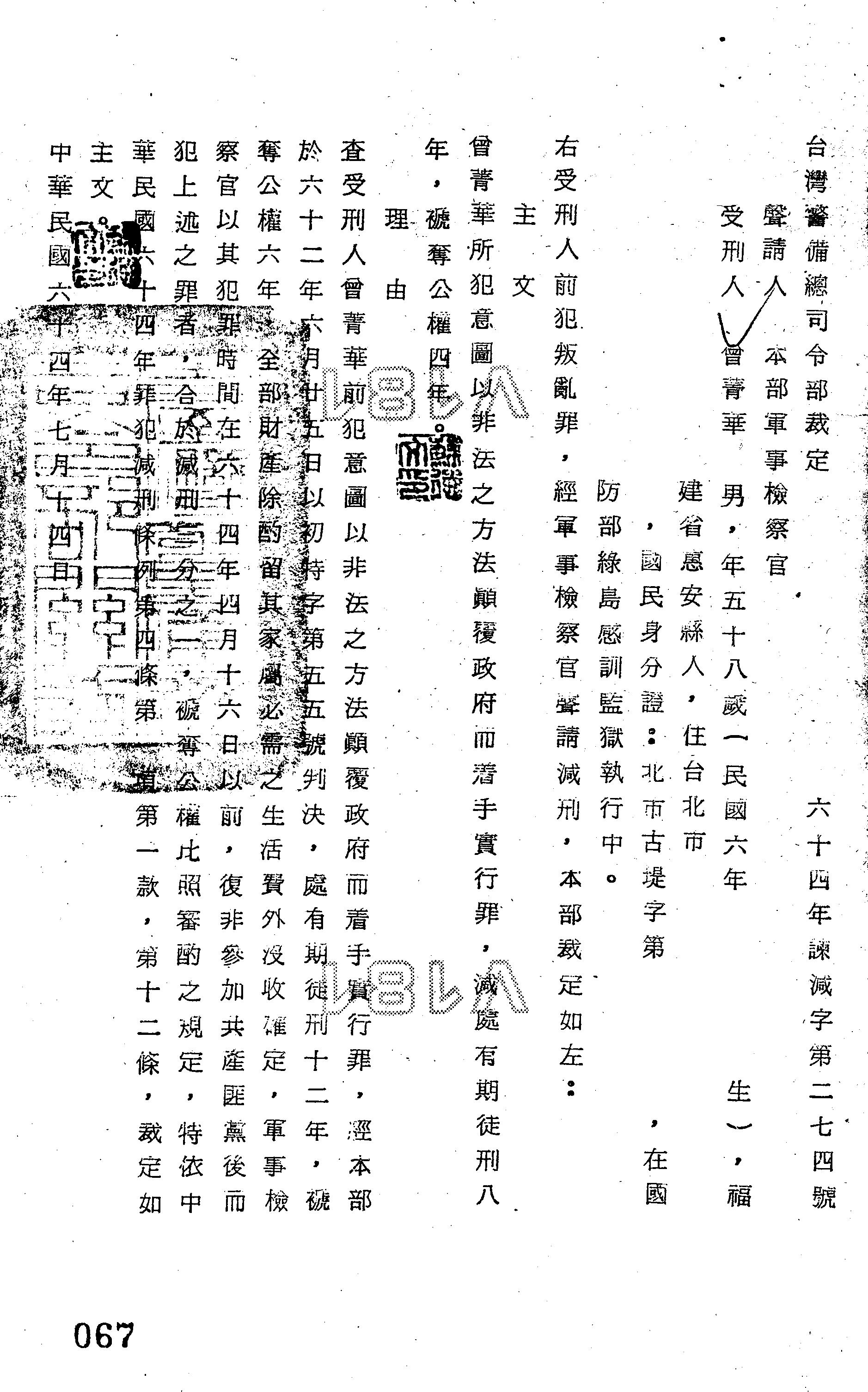 臺灣警備總司令部64年諫減字第0274號裁定書