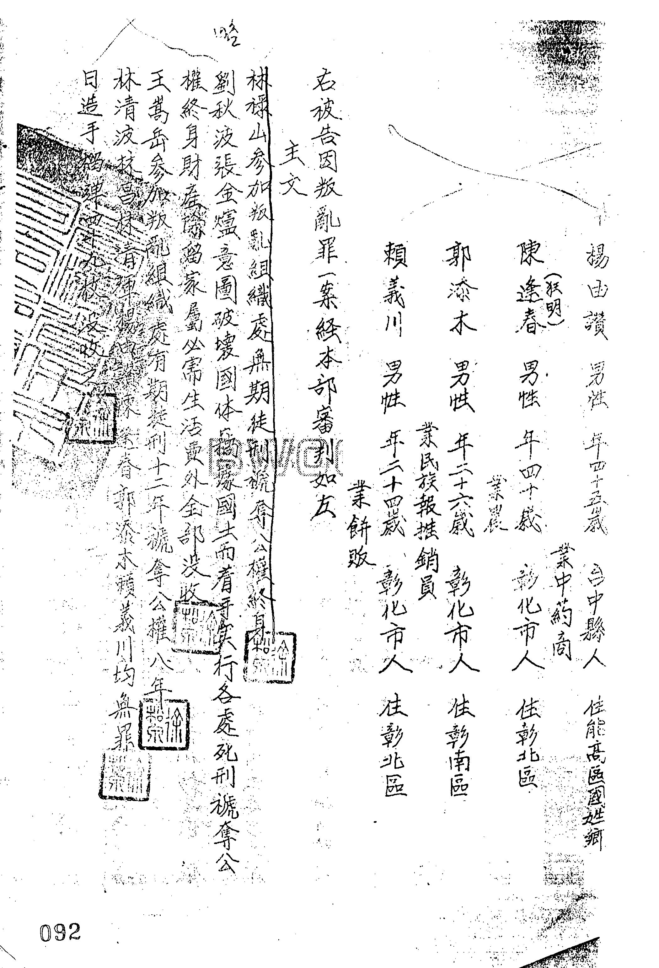 - 法條:修正戒嚴法第8條第2項;修正懲治叛亂條例第2條第1項、第5條、第8條第1項、第12條;刑法第100條第1項、第55條、第187條、第37條第1項、第37條第2項、第38條第1項第1款、第38條第1項第2款;刑事訴訟法第291條前段、第293條第1項